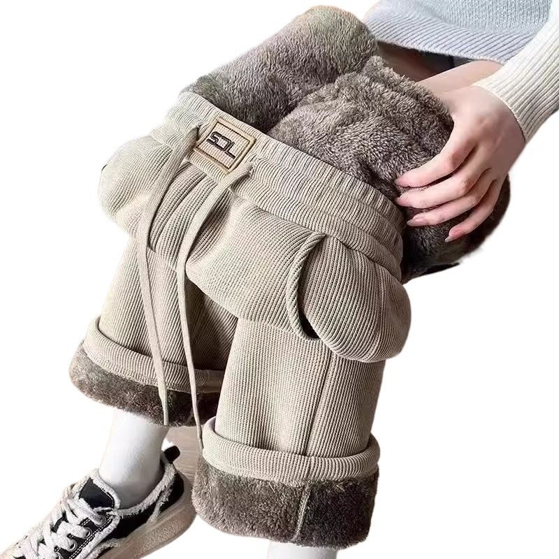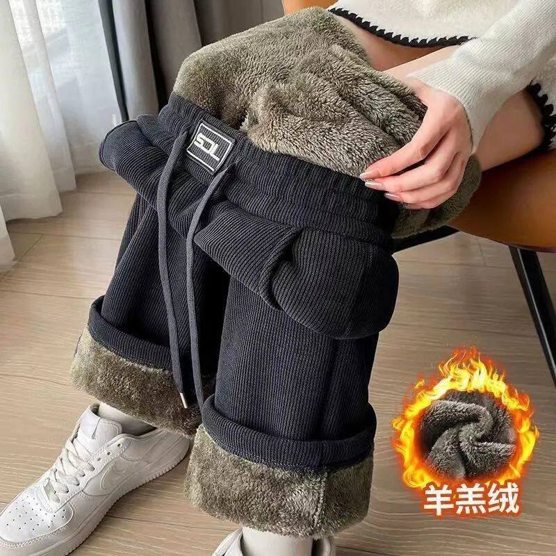 加绒阔腿裤女秋冬季大码加厚2025新款羊羔绒直筒灯芯绒裤子白色