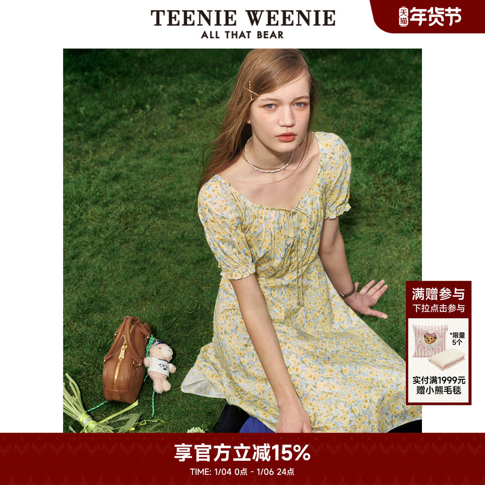TeenieWeenie小熊奥莱轻薄方领碎花连衣裙法式泡泡袖复古花朵短裙