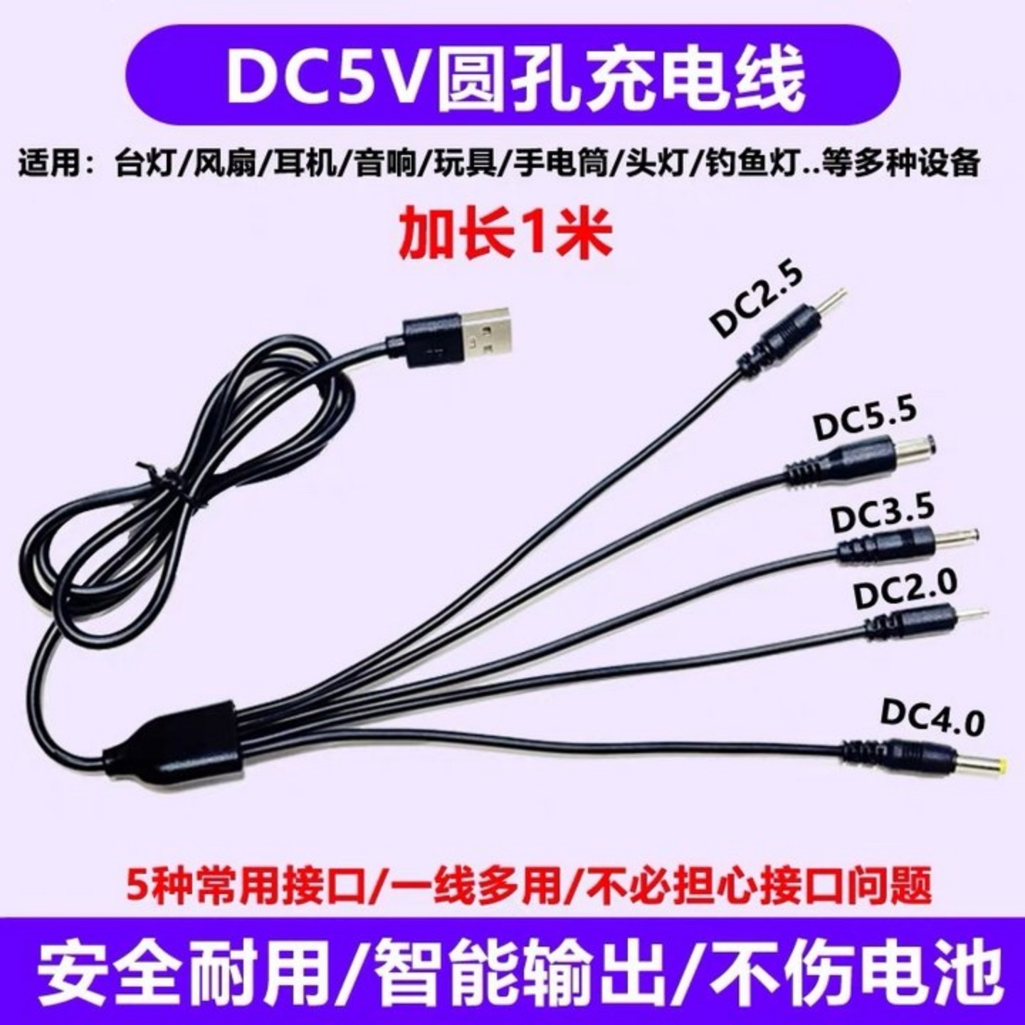 DC5V一拖五通用3.5mm圆形口充电线4.0圆头2.0台灯牙刷dc2.5圆孔5.5洁面仪洗脸仪玩具音响电动小风扇充电线USB