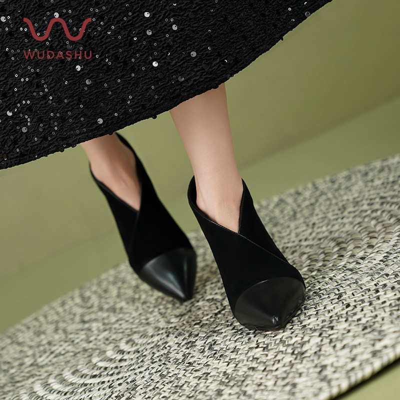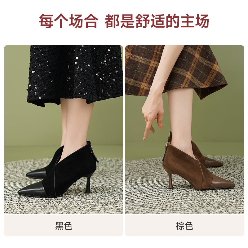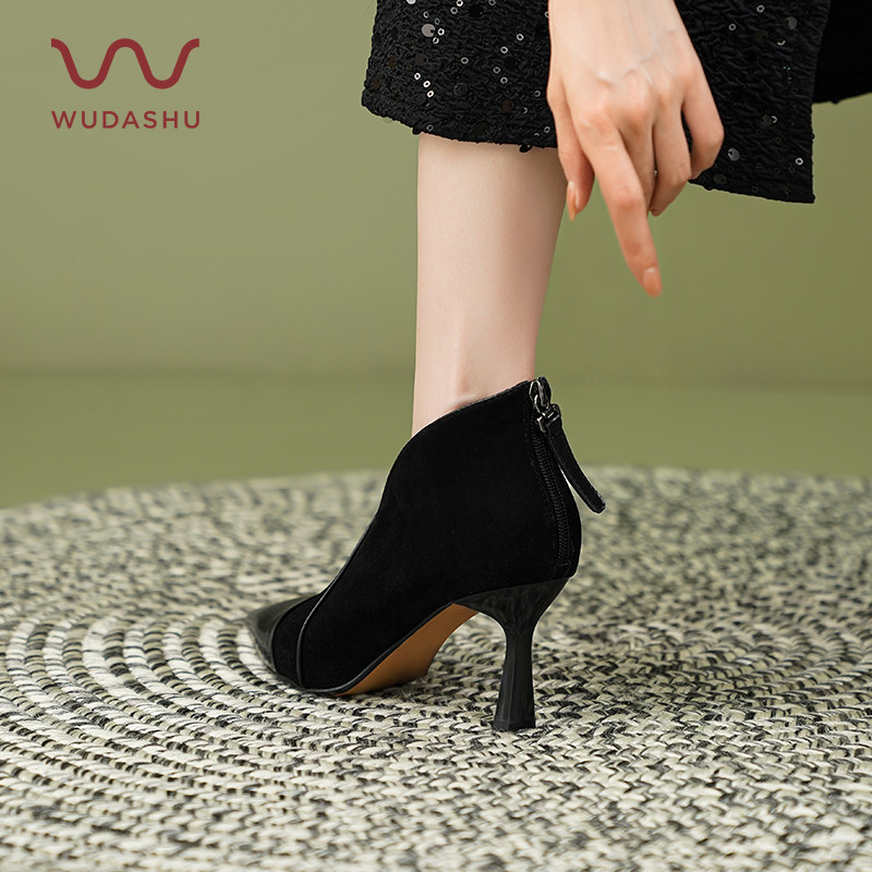 吴大叔2025秋冬时尚尖头短靴细跟拼接踝靴高级感真皮显瘦高跟女靴
