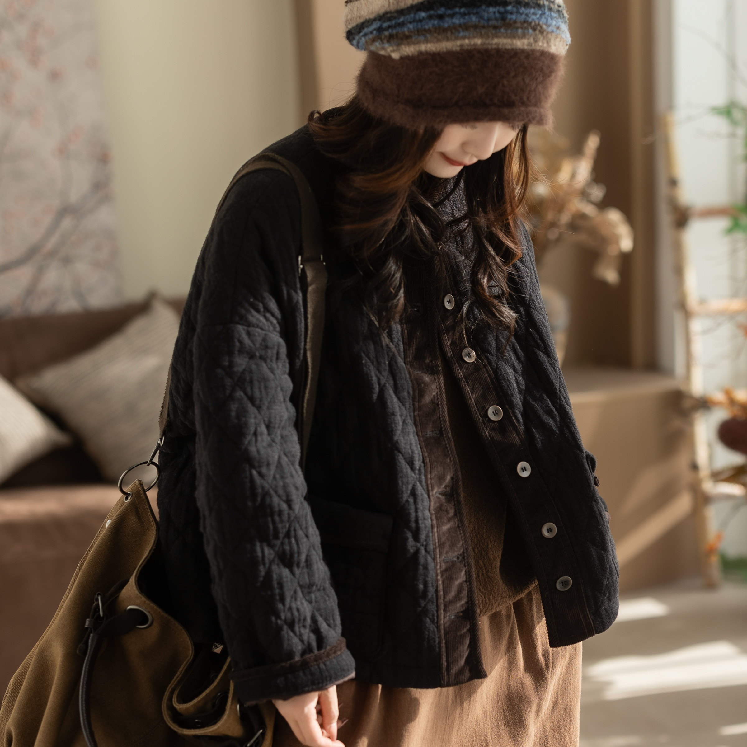 咖咪羽棉衣女冬装新款女士休闲亚麻宽松百搭复古流行好看女装棉袄
