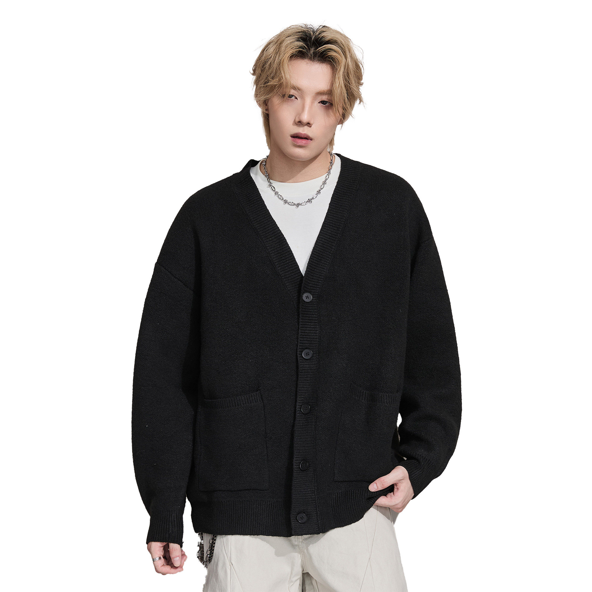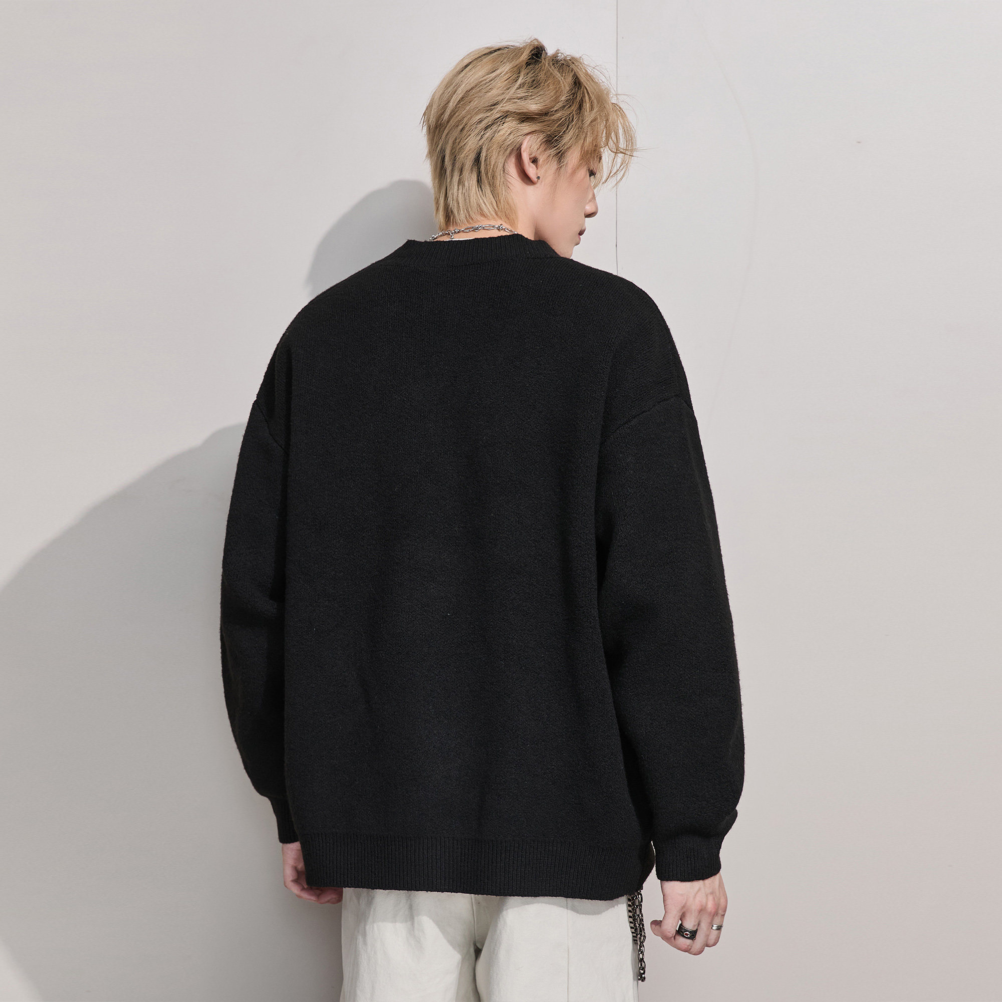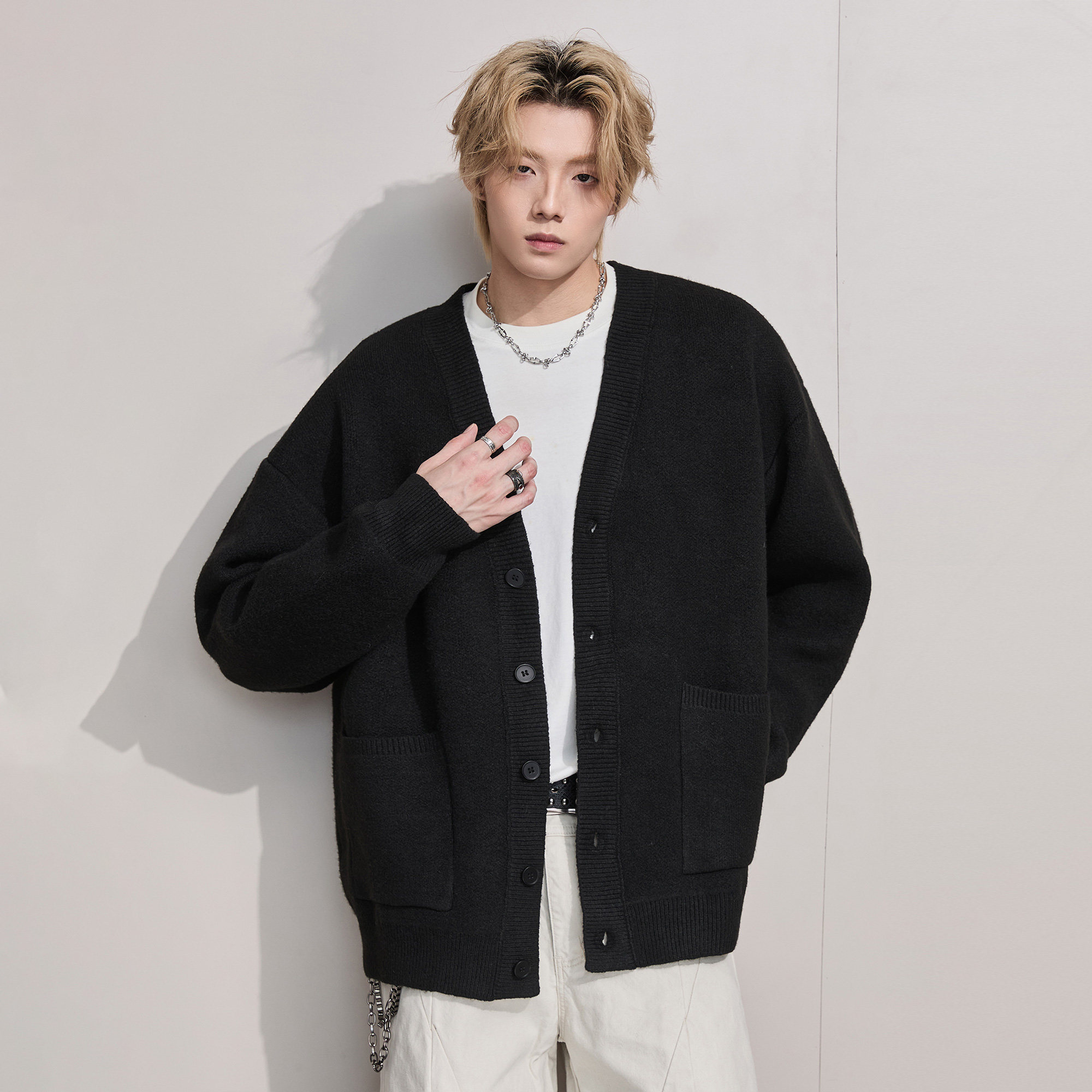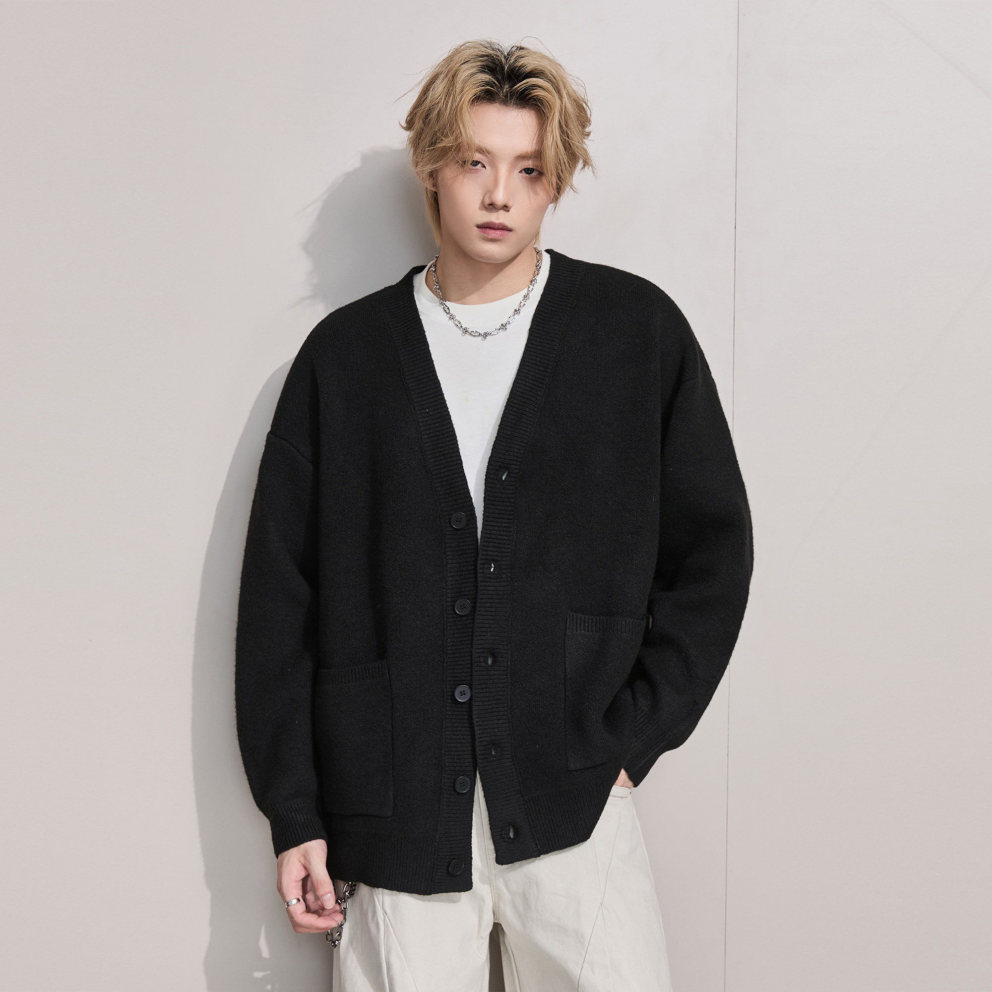 ALLIN 美式V领针织开衫男秋冬慵懒黑色宽松线衣情侣潮牌毛衣外套