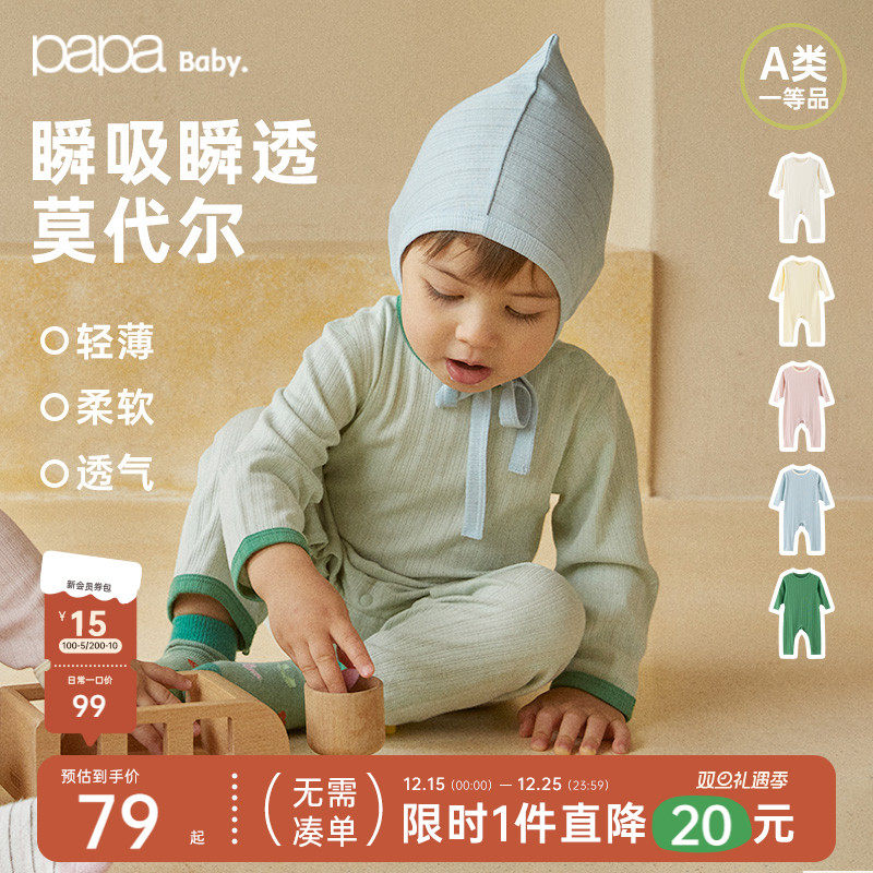 【QQ棉】papa爬爬秋装莫代尔婴儿连体衣长袖套头包屁衣宝宝睡衣