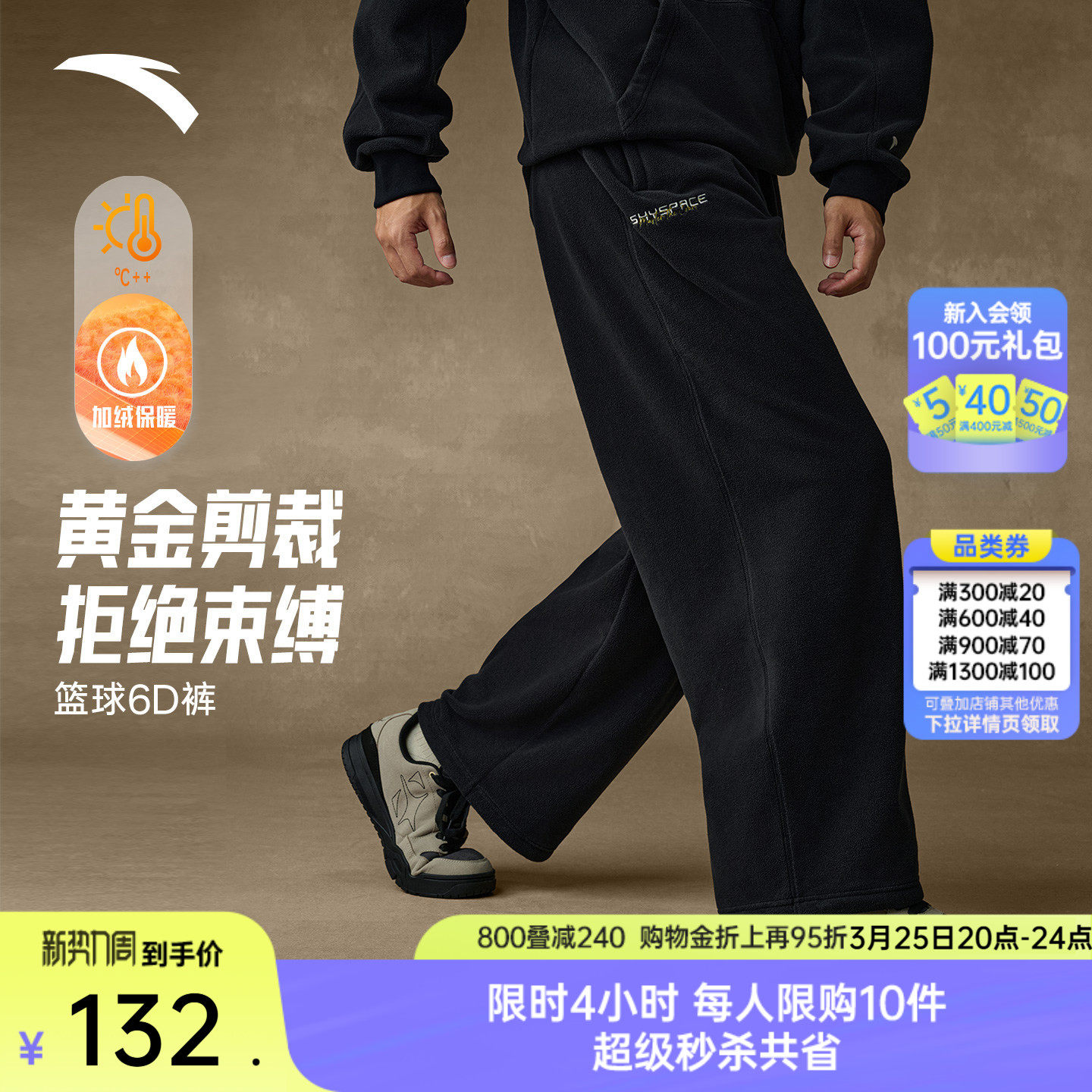 安踏篮球6D裤丨复古美式摇粒绒长裤男冬季加绒直筒阔腿裤休闲裤子