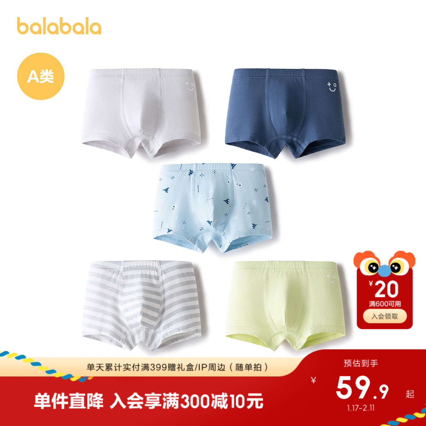 巴拉巴拉儿童内裤棉a类男童平角短裤小童中大童柔弹四角裤五条装