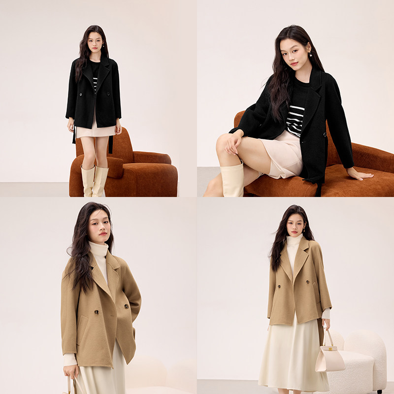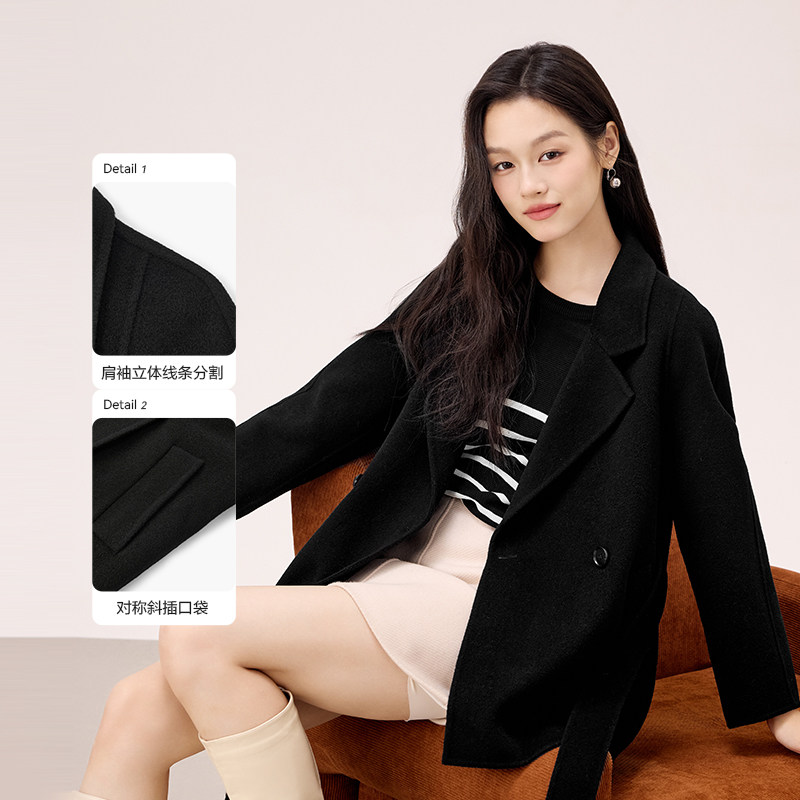 爱居兔100%绵羊毛双面呢外套女冬季新款高级感短款毛呢大衣