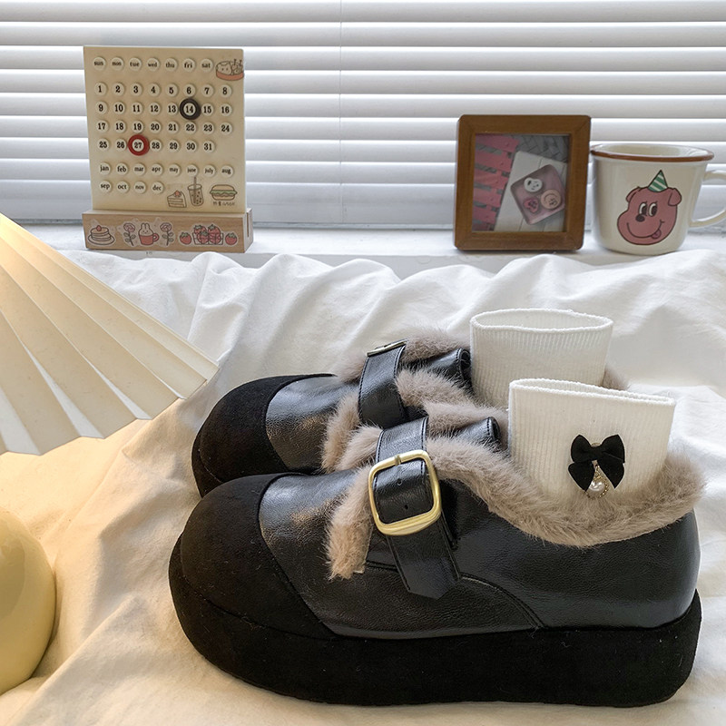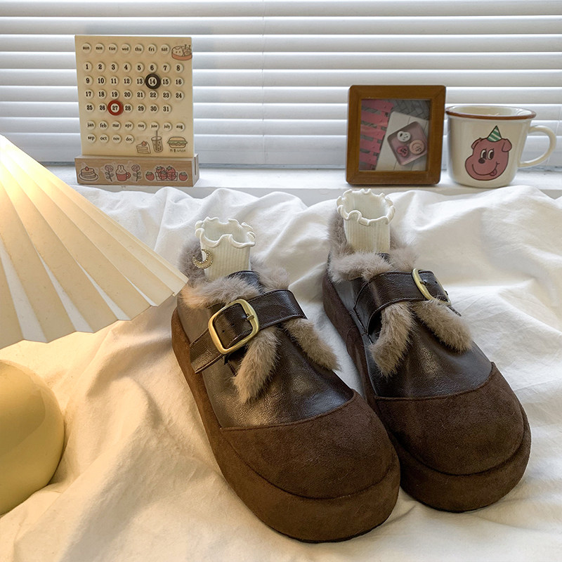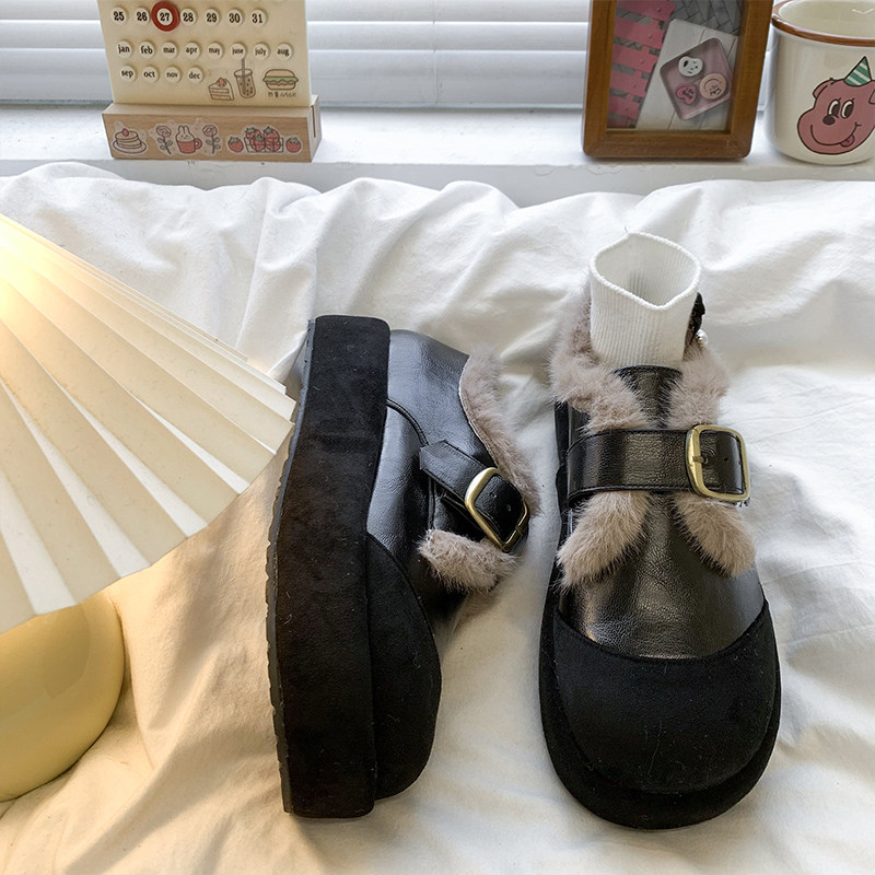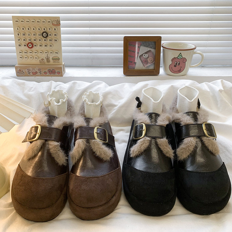 复古松糕厚底毛毛乐福鞋女2025秋冬季新款加绒雪地靴拼接勃肯棉鞋