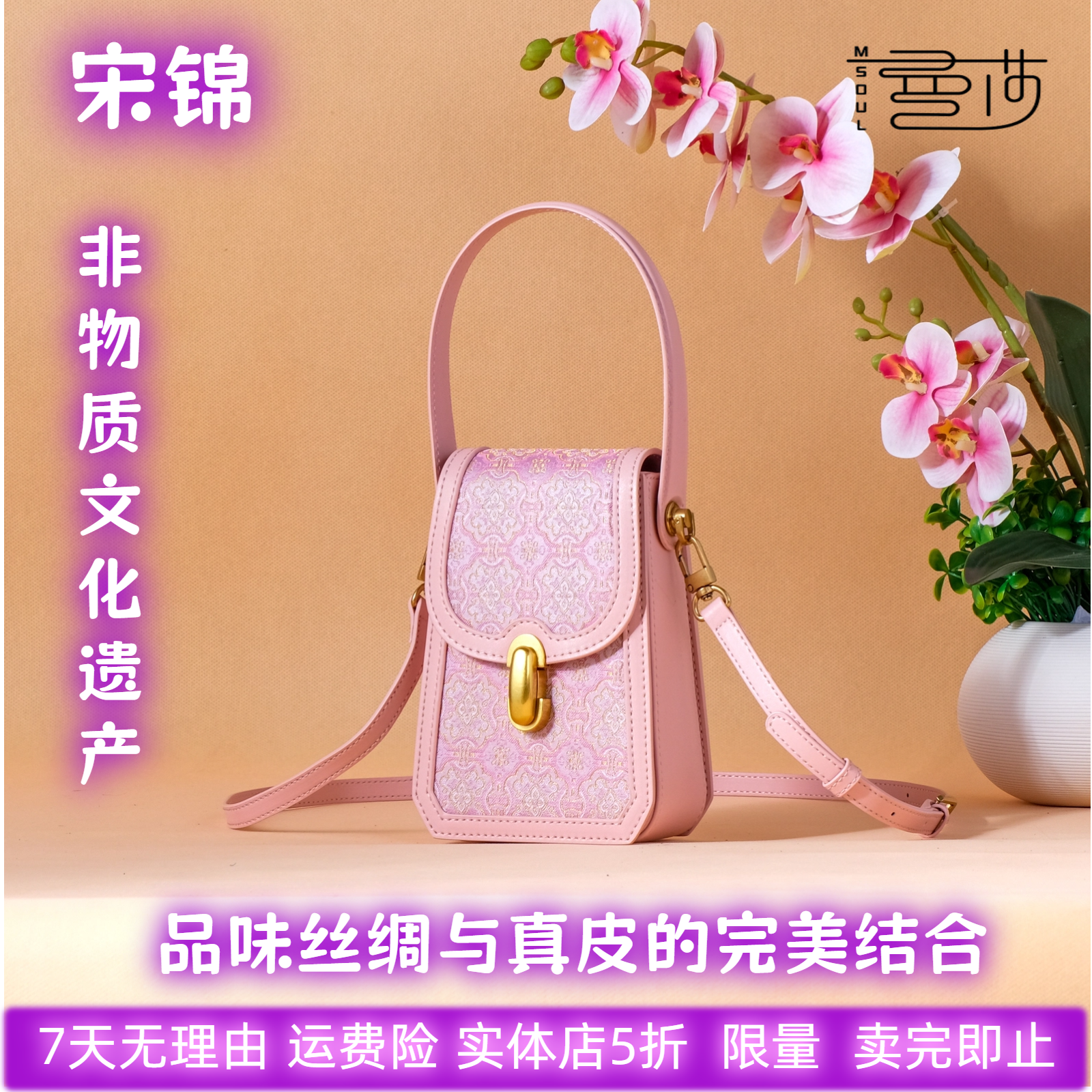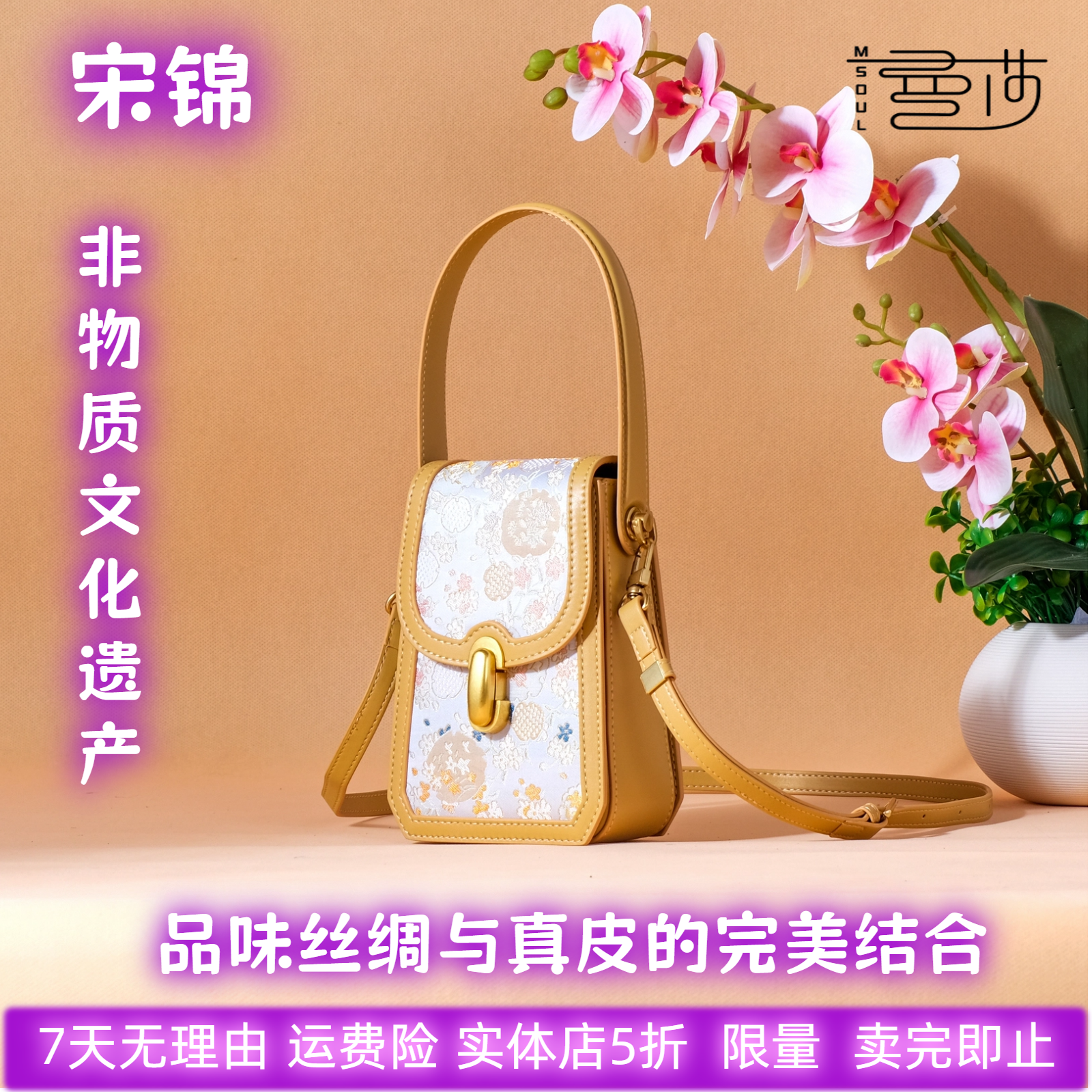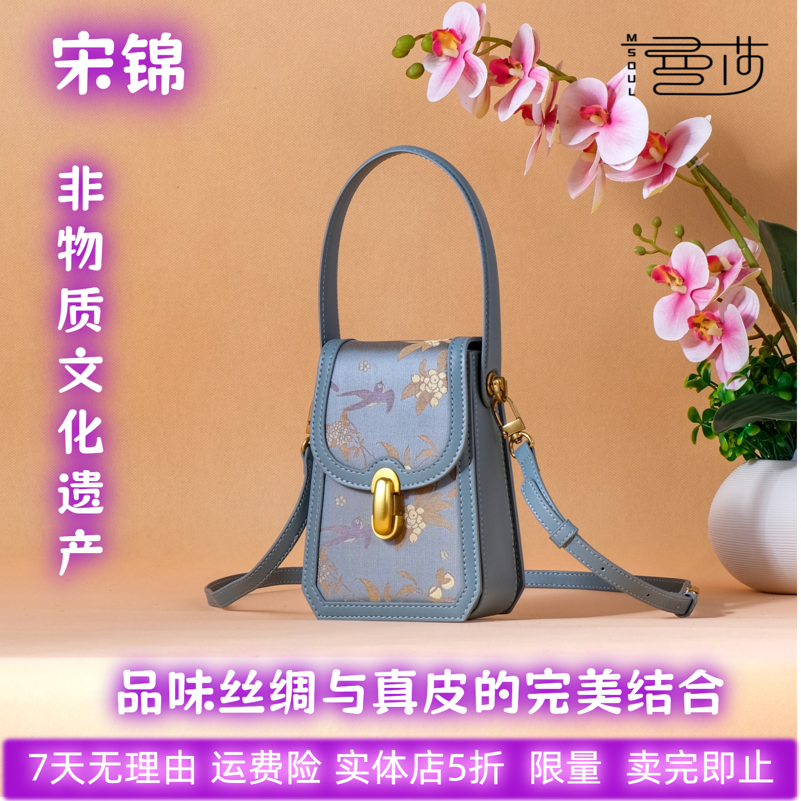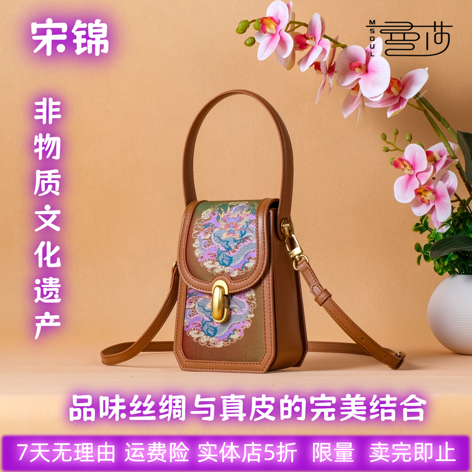 曼莎中国风宋锦香云纱手提单肩斜挎刺绣真丝牛皮手提女包3108