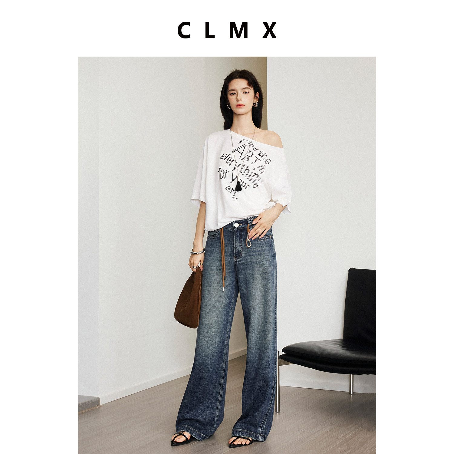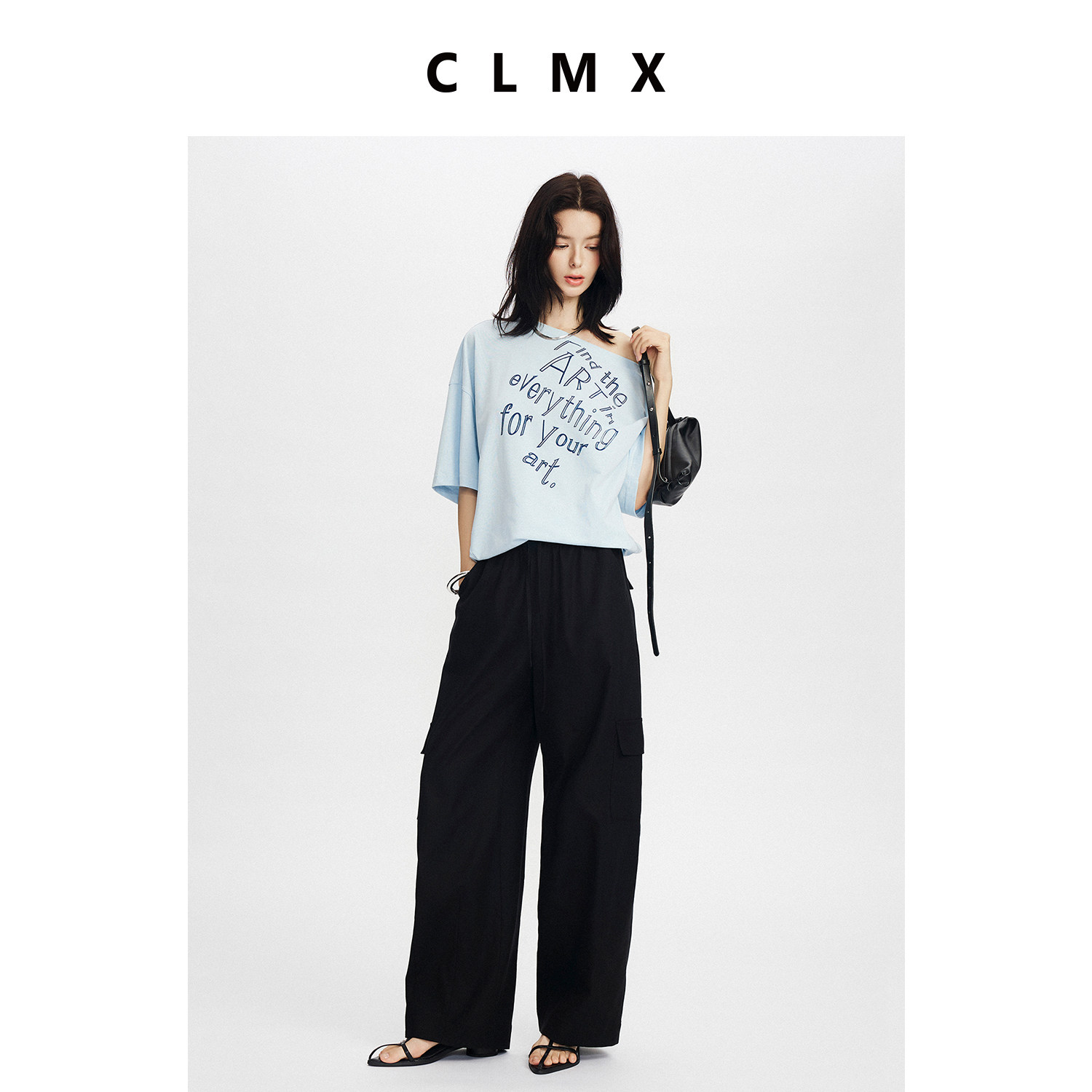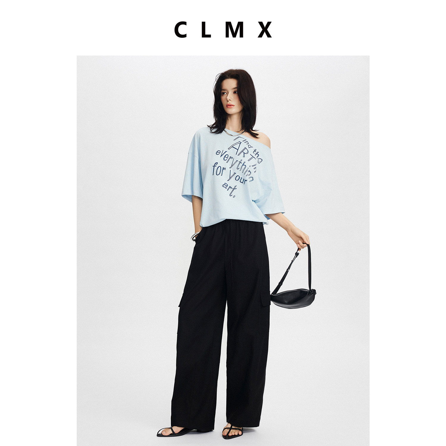 CLMX宽松一字领T恤棉亚麻混纺针织面料漫画感字母印花露肩上衣女