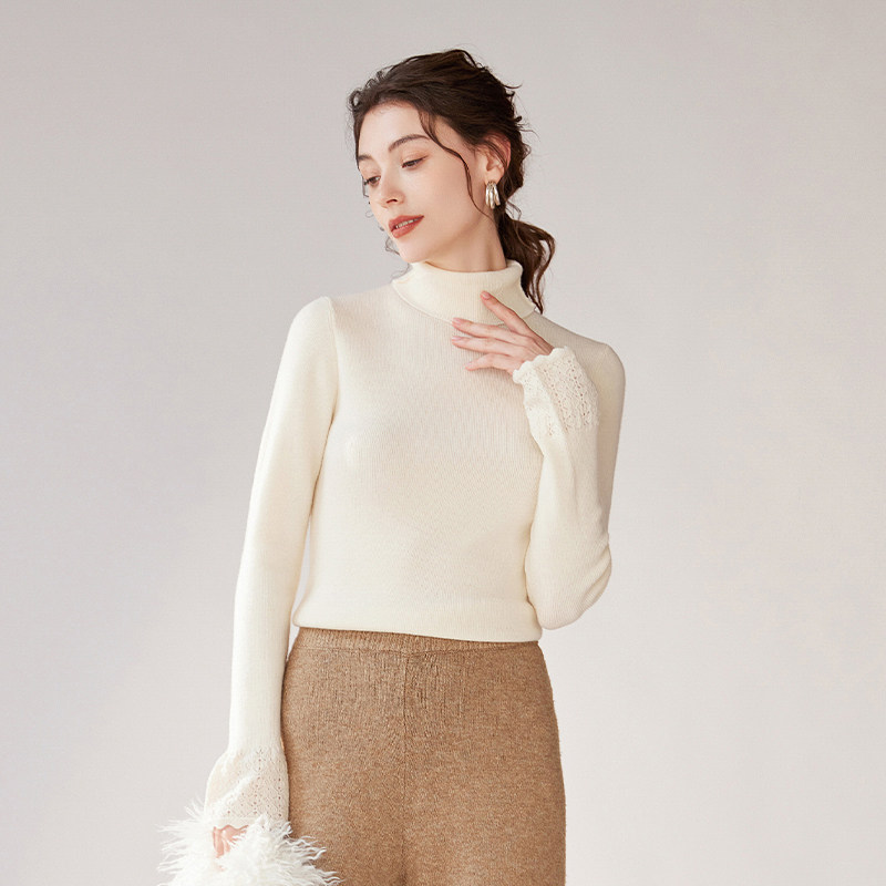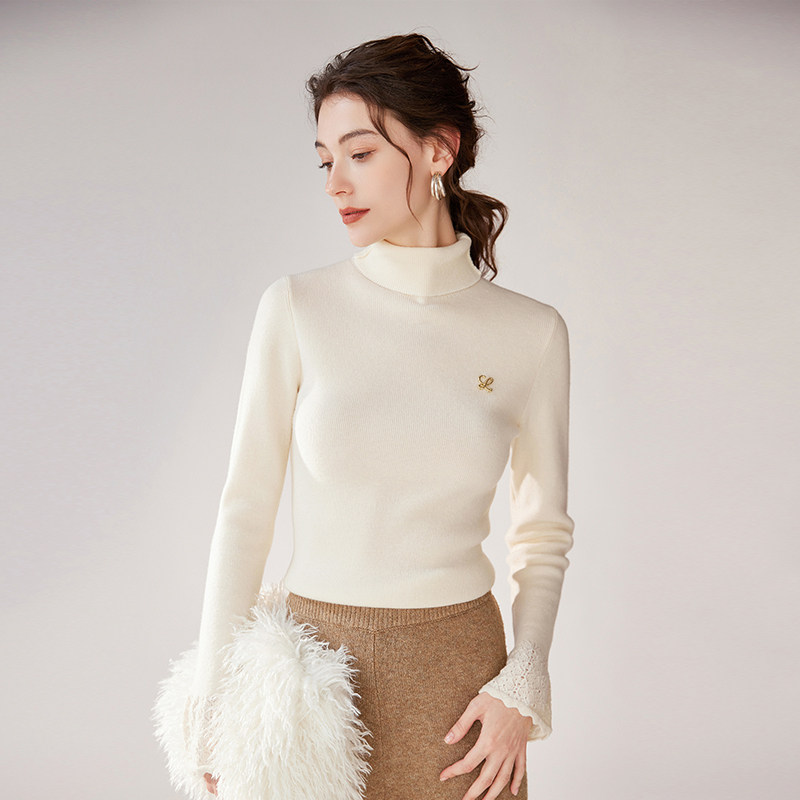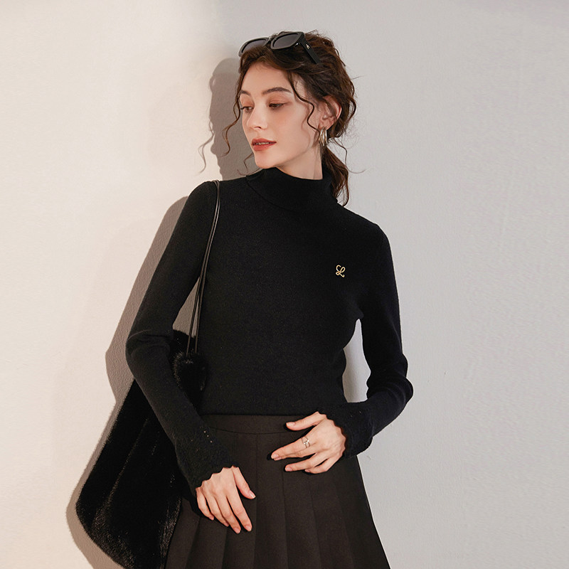 白鹿语时尚休闲高领打底衫冬新款金属标钩花喇叭袖女式针织衫