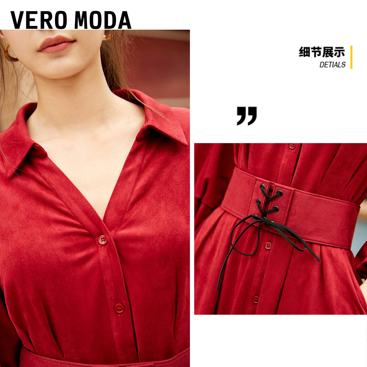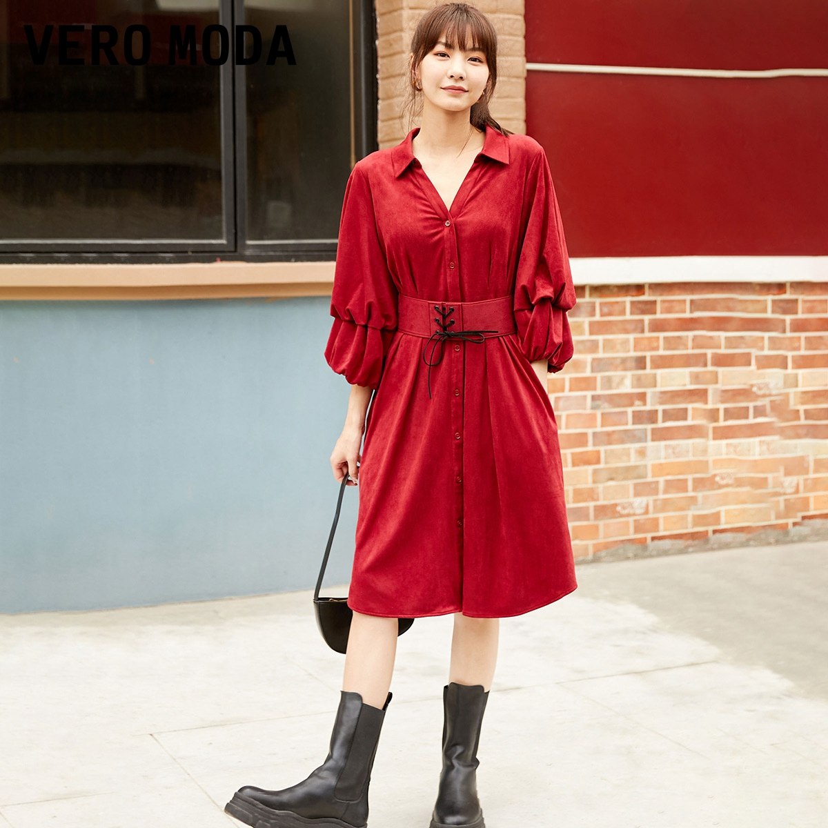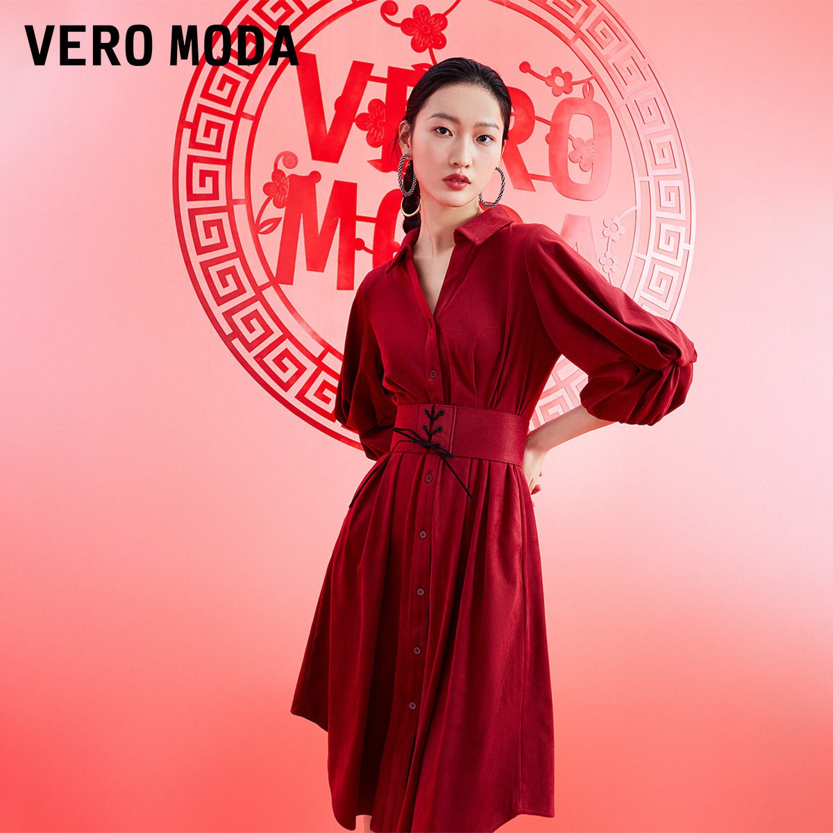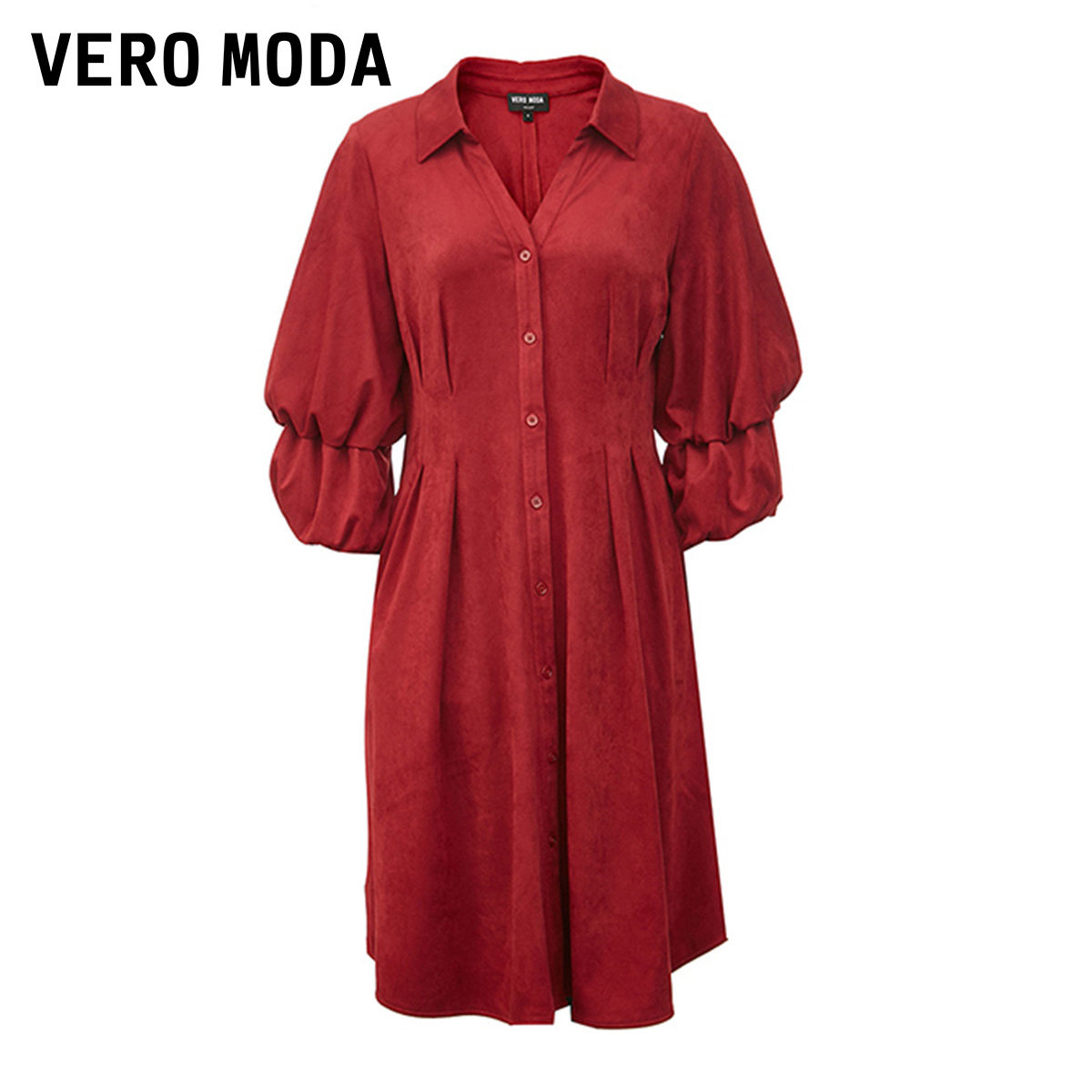 Vero Moda奥莱连衣裙子秋季清仓复古优雅微弹面料V领花苞袖束腰女