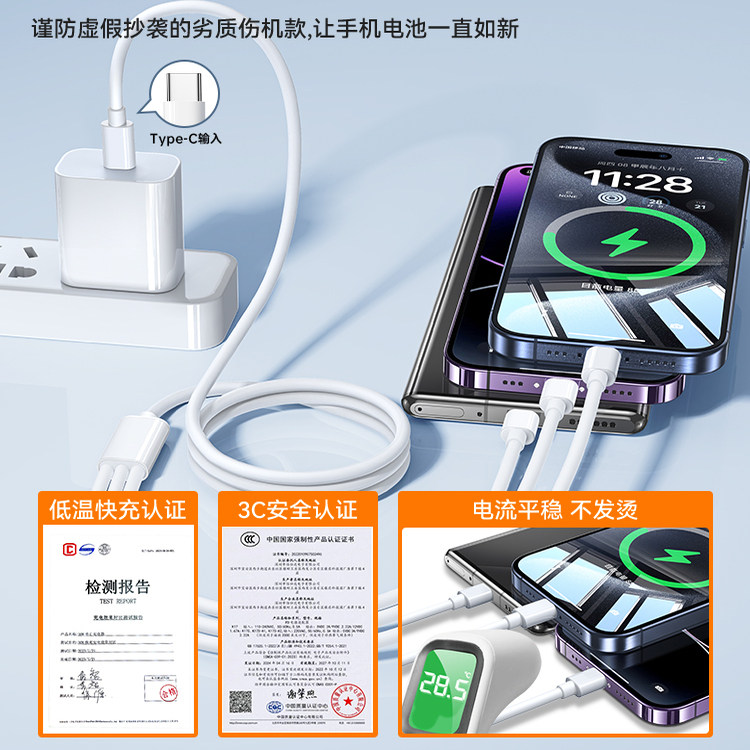 铂信Typec三合一数据线充电器线车载一拖三120W快充100适用苹果17Pro华为安卓头接口转双C口一拖三多功能电器