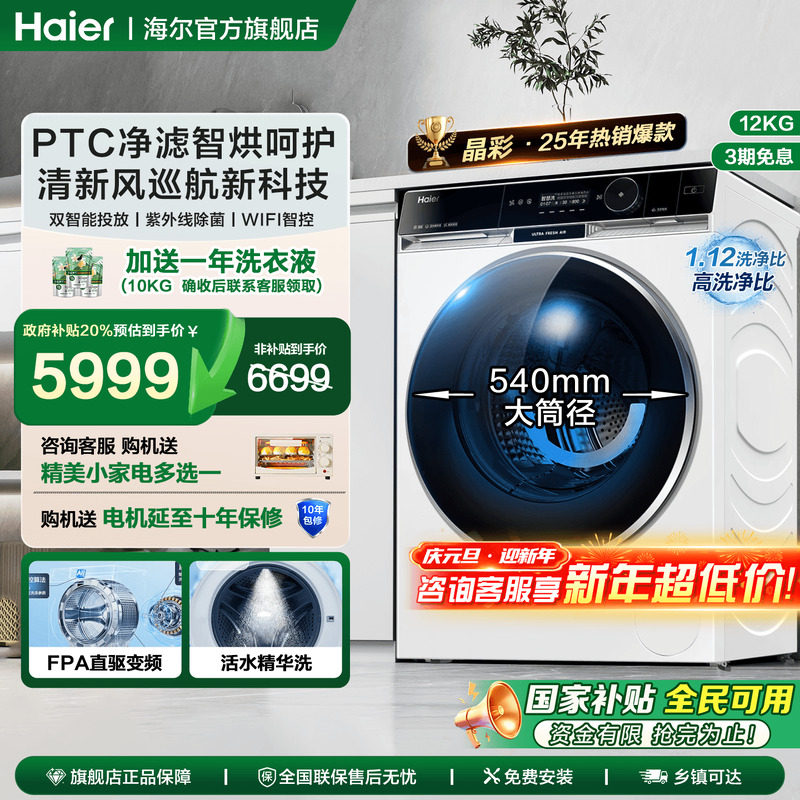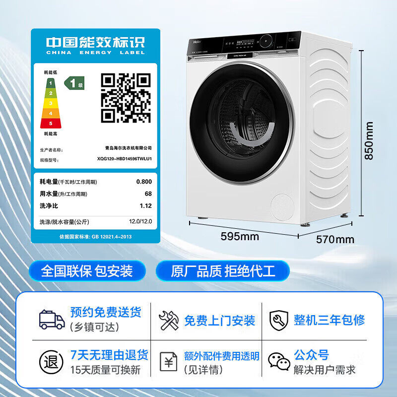 政府补贴海尔白色12kg全自动家用直驱变频滚筒洗衣机洗烘一体596