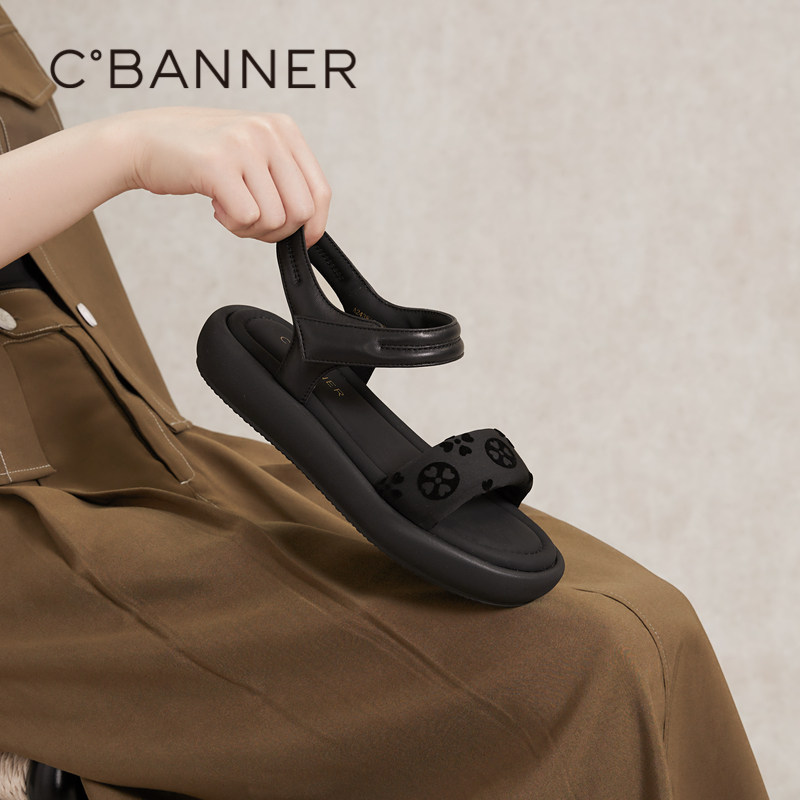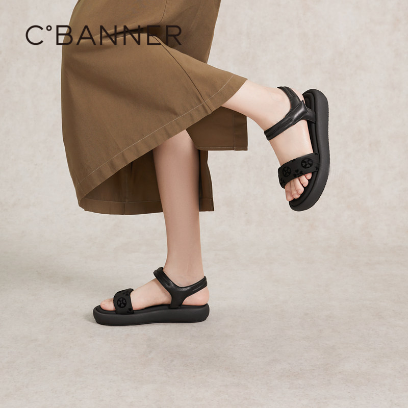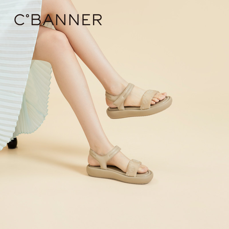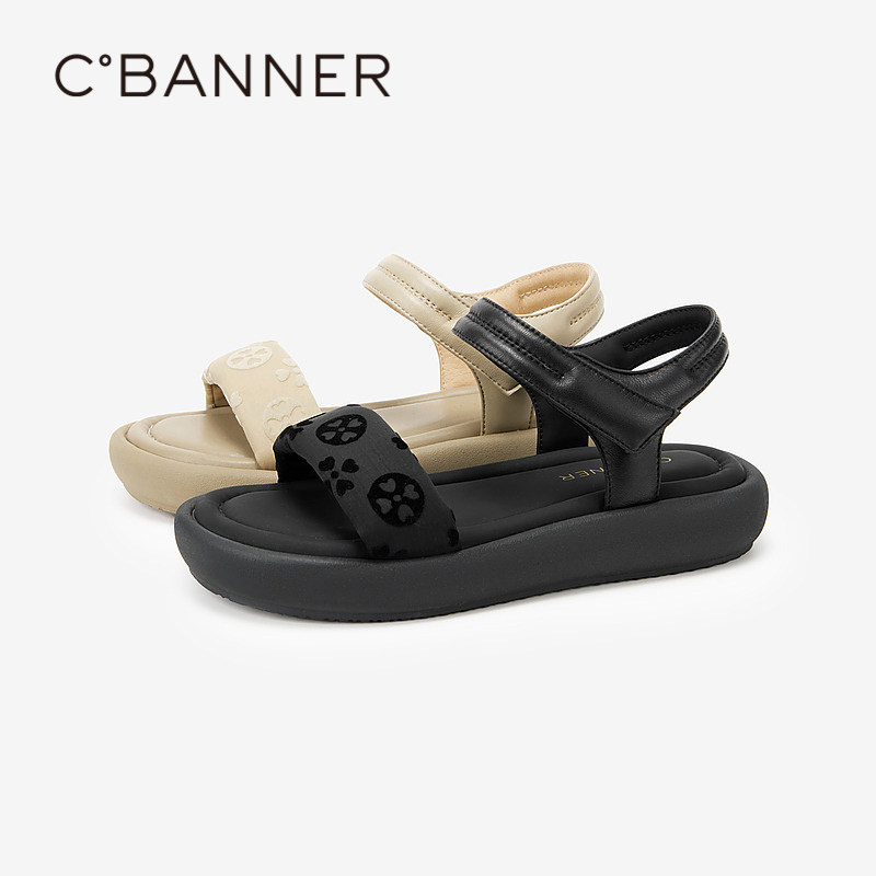 千百度面包平底休闲凉鞋女款夏季新款魔术贴度假海滩外穿凉鞋