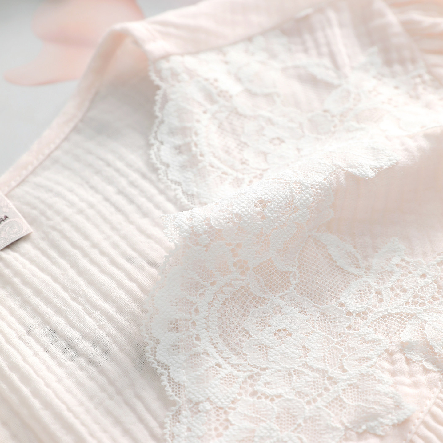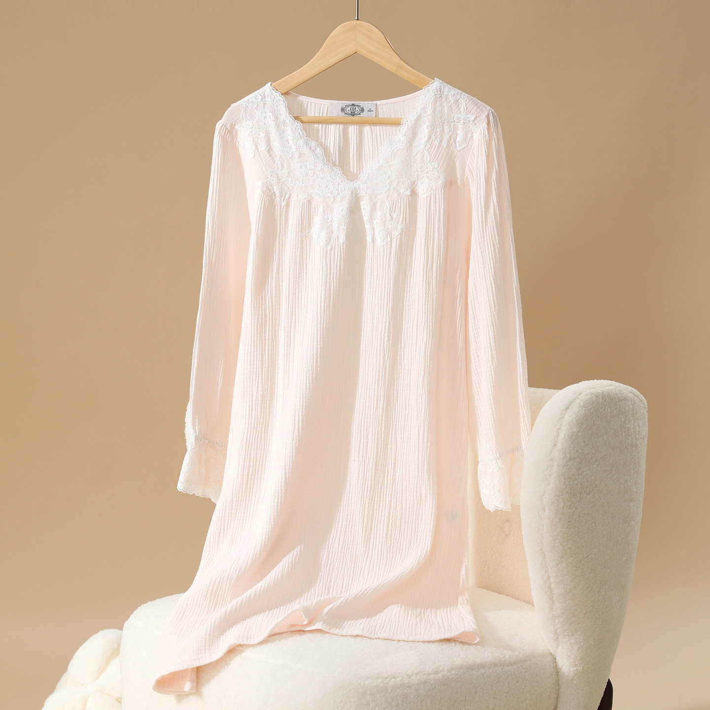 美标春秋新品长袖纯棉睡裙女双层棉纱宫廷风蕾丝全棉睡衣家居服冬