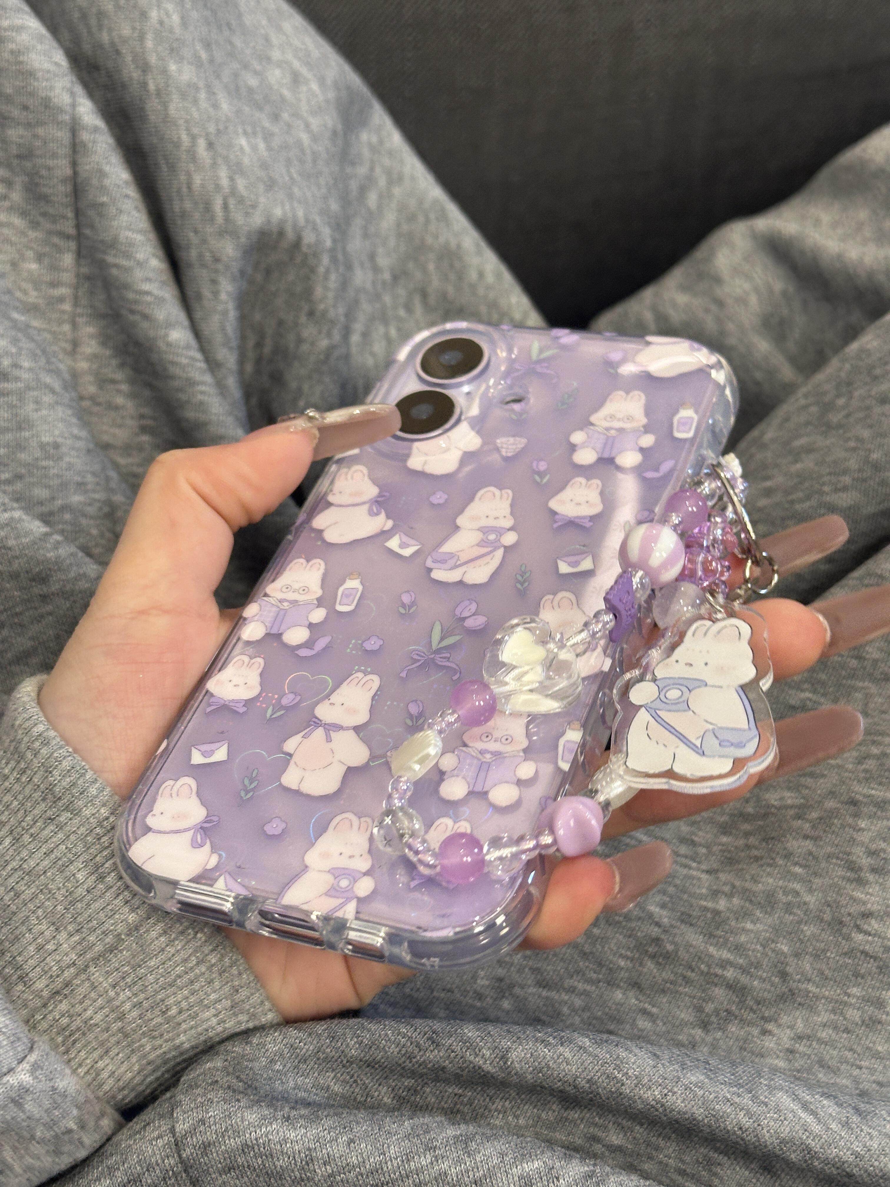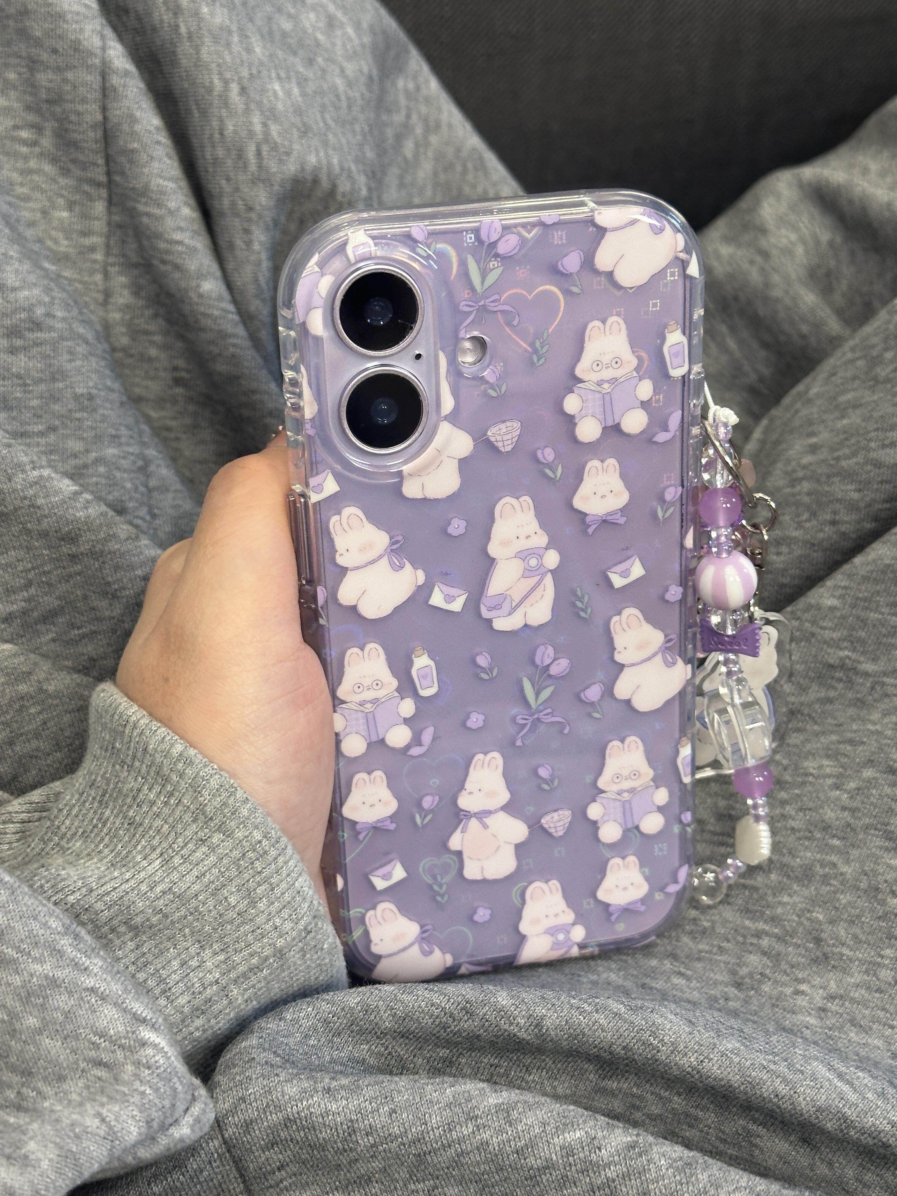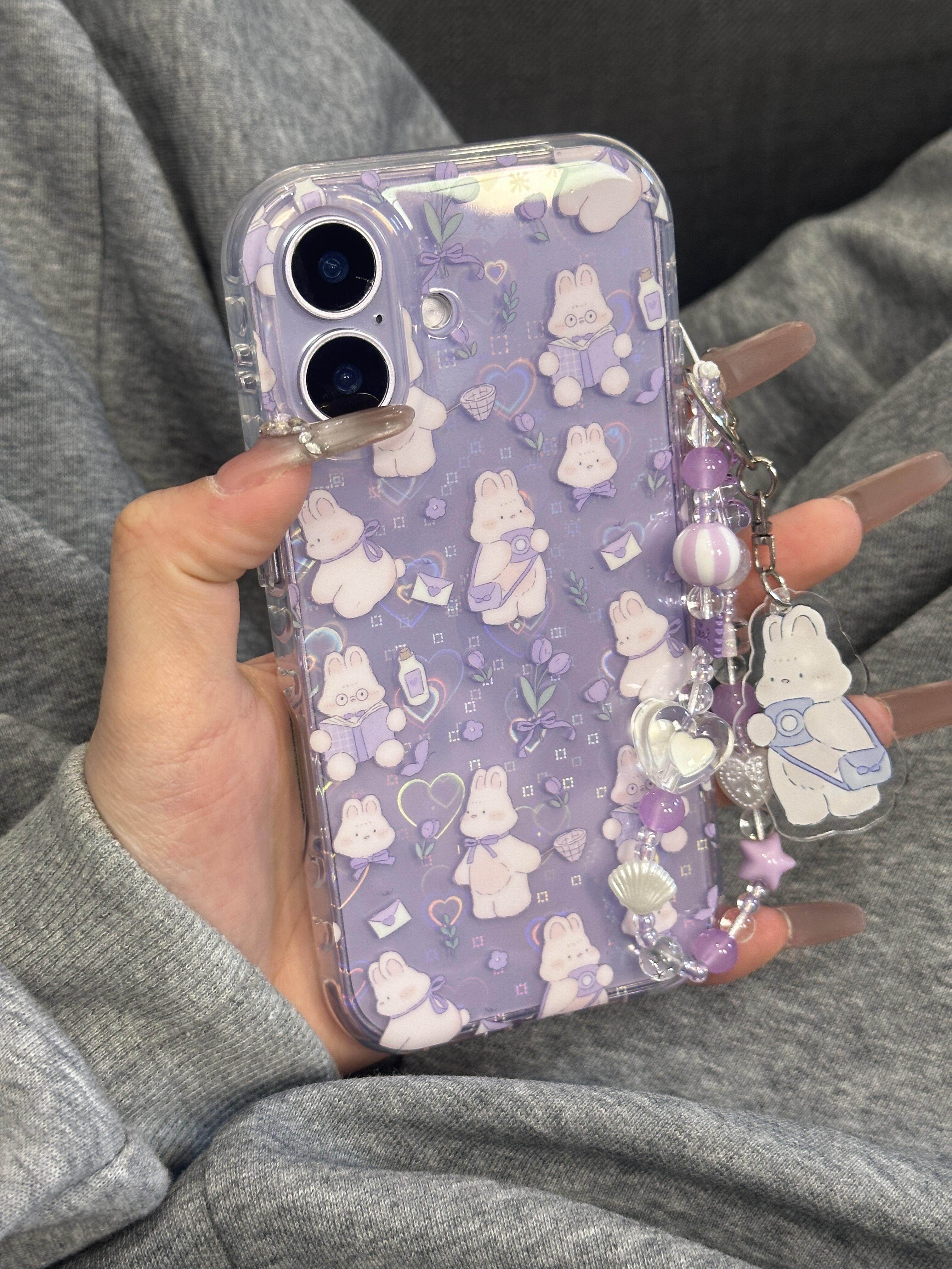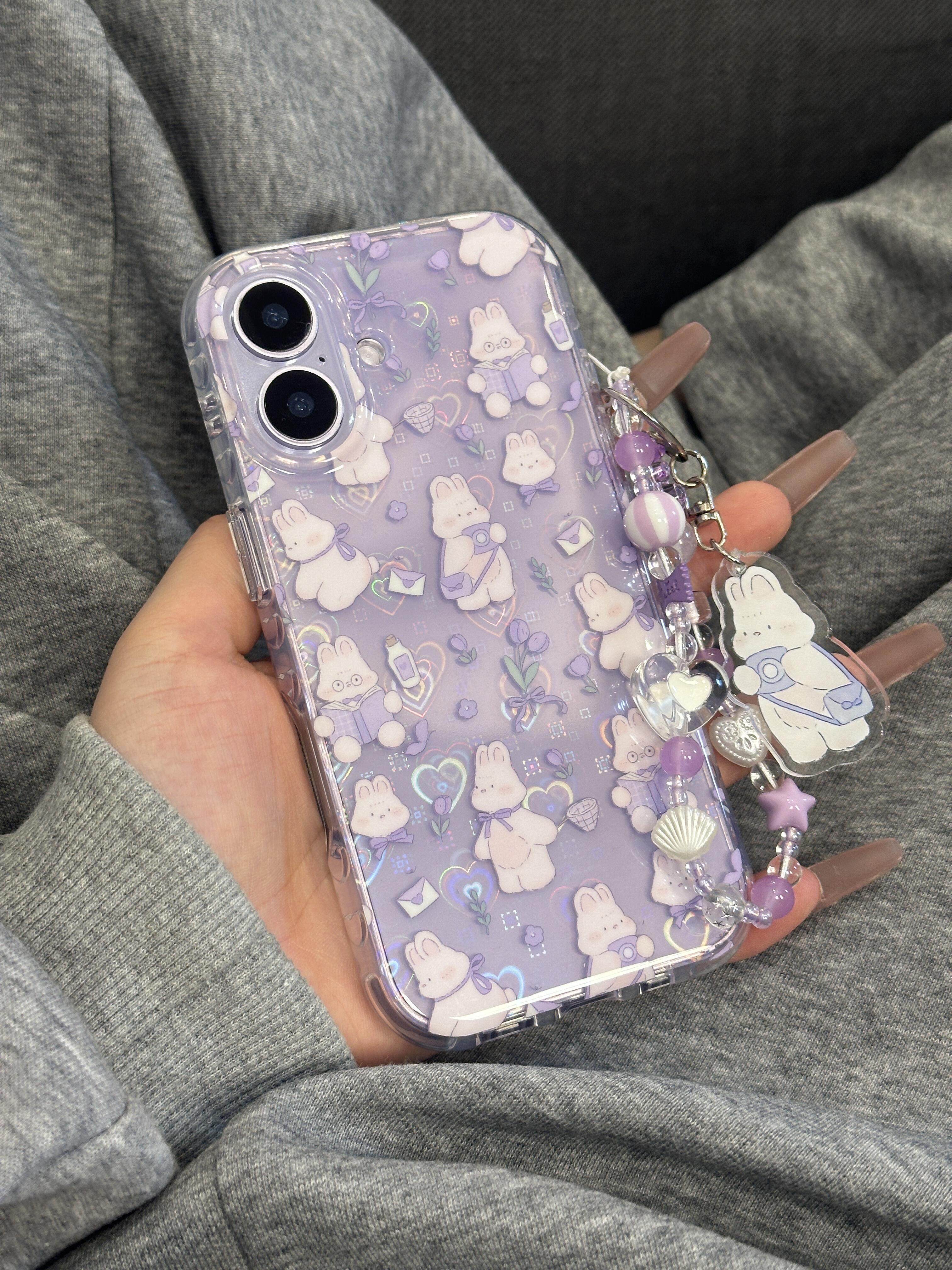 ins清新紫色镭射爱心碎花兔子插画链条17pro适用iPhone17新款苹果17ProMax手机壳14少女心16韩系全包13防摔15