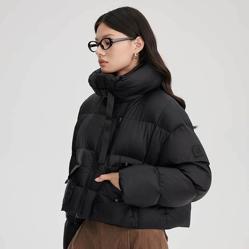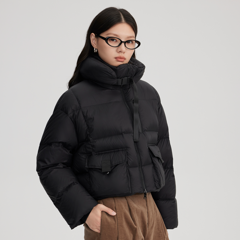 艾莱依黑色短款鹅绒服女新款休闲泡芙外套可脱卸U形枕羽绒服反季
