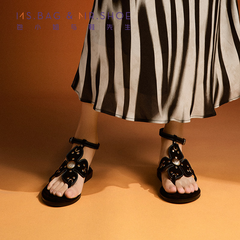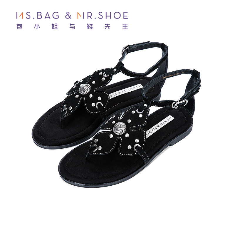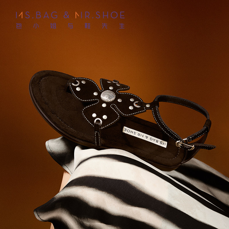 包小姐与鞋先生2026年夏季新款黑色复古风铆钉平底夹脚凉鞋262154