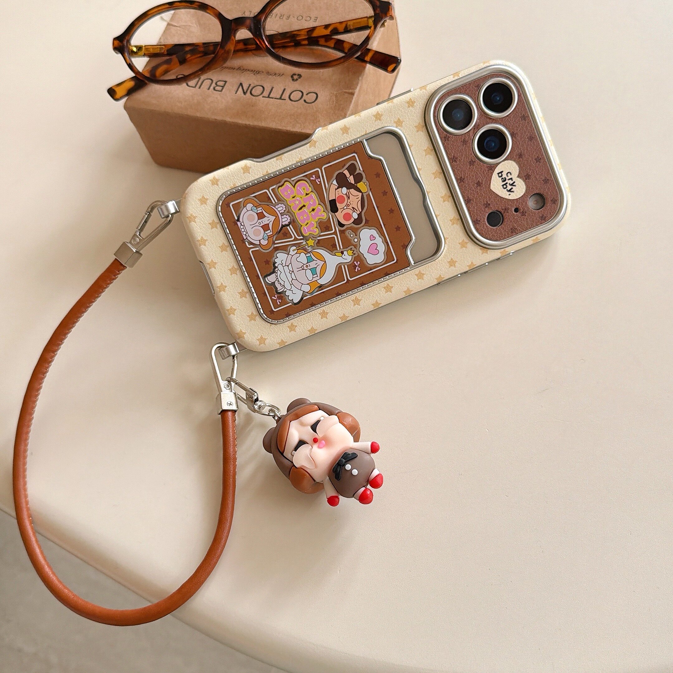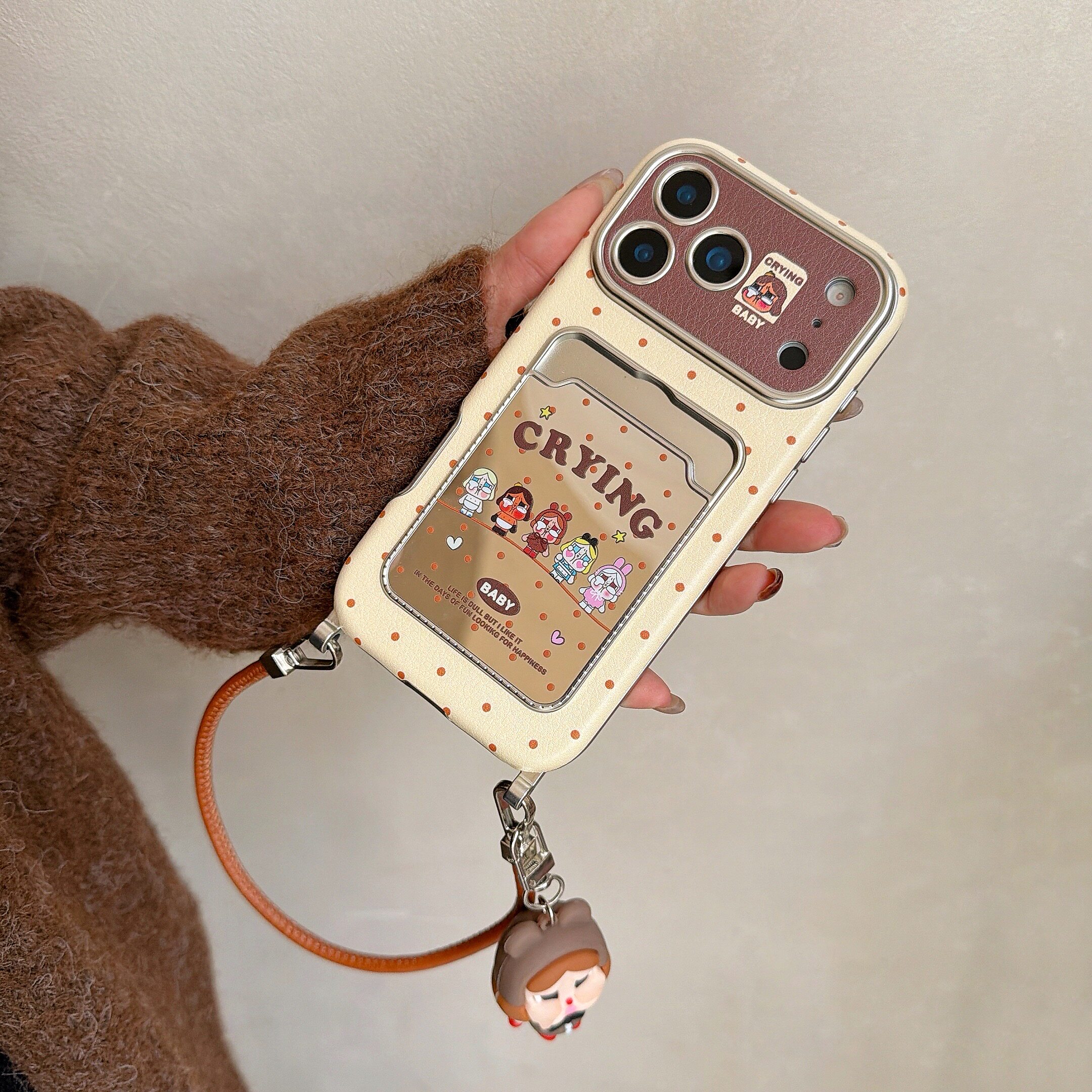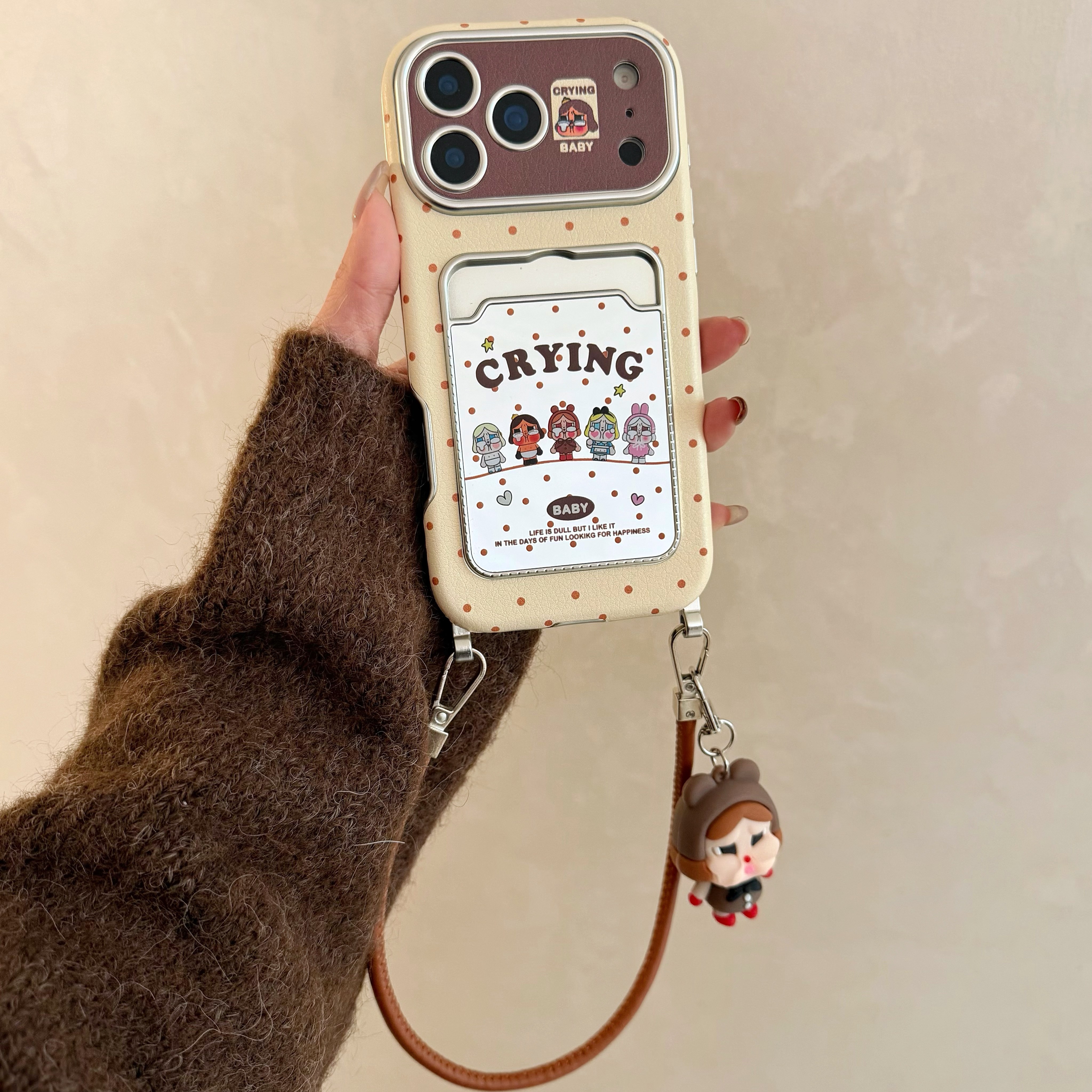 秋冬棕波点卡套哭娃公仔适用苹果17promax手机壳iphone16pro新款13女14腕带挂绳15pro斜挎背带全包防摔手机套