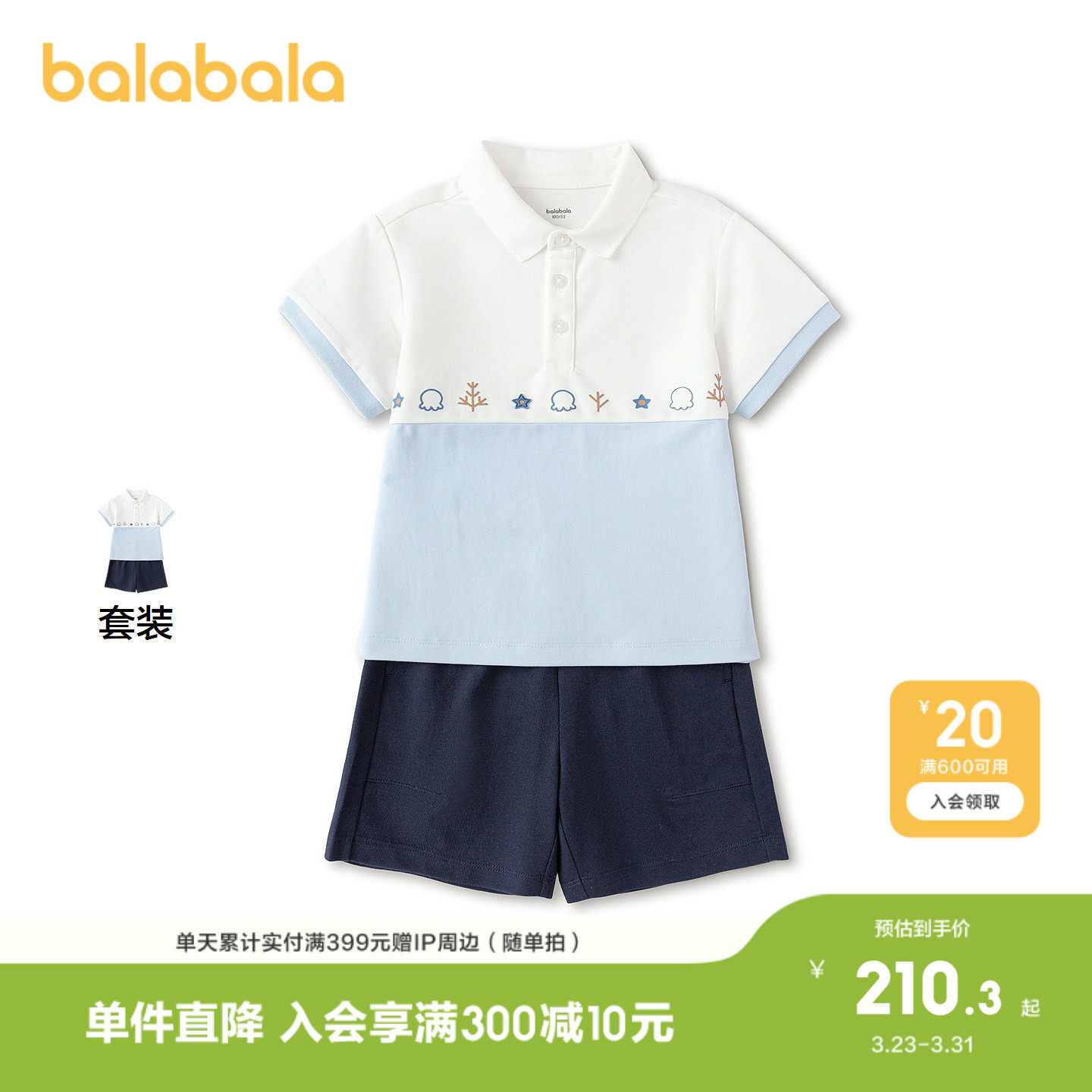 【商场同款】巴拉巴拉儿童套装男童2026新款夏精致拼色POLO上下装