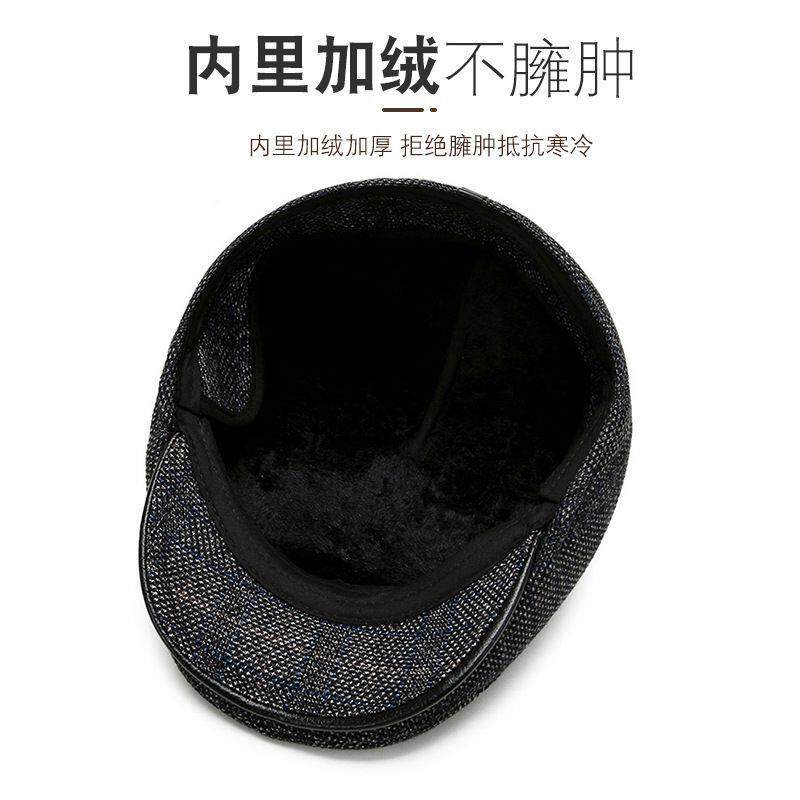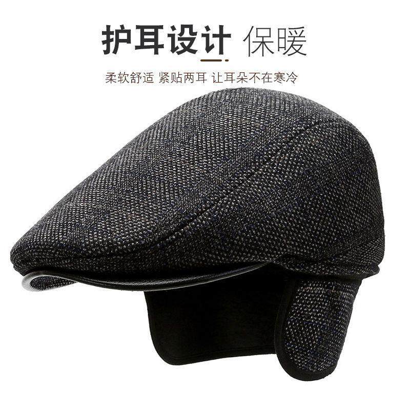 秋冬新款格子毛呢前进贝雷帽男士中老年加绒护耳鸭舌帽子平顶抗寒