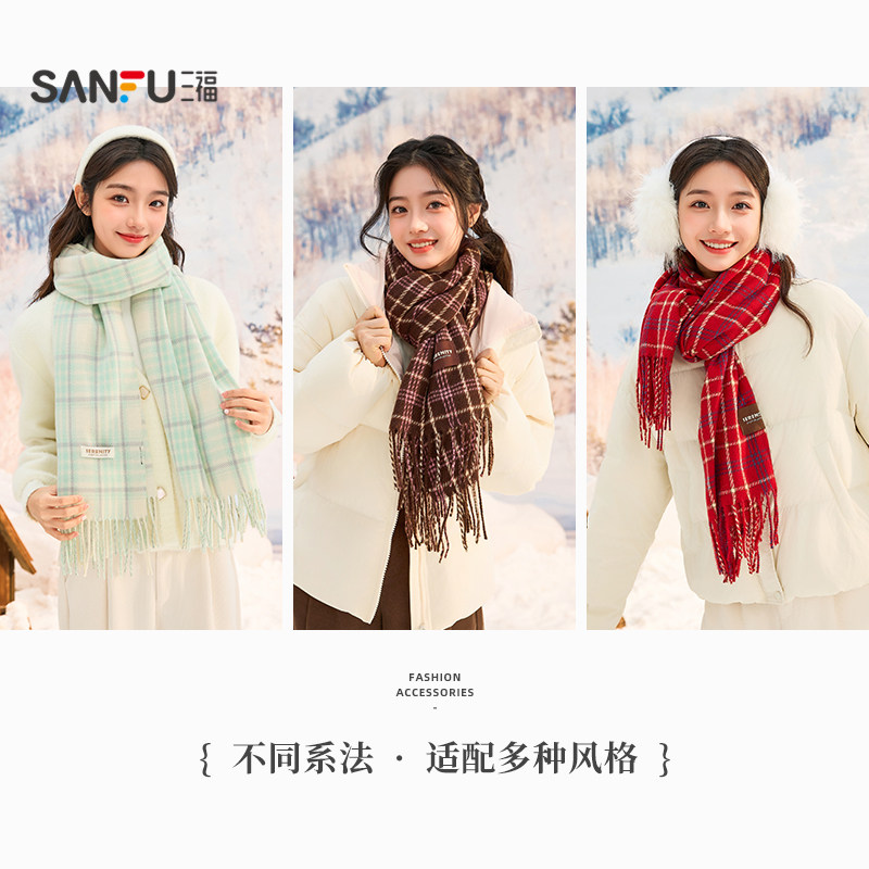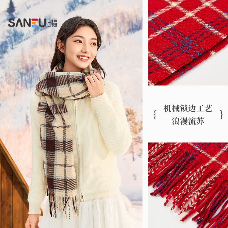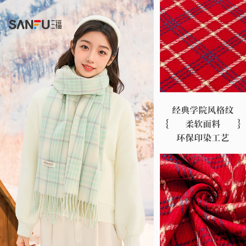 三福格子围巾韩系高级感红色保暖围脖旅游格纹围巾女款冬2025新款