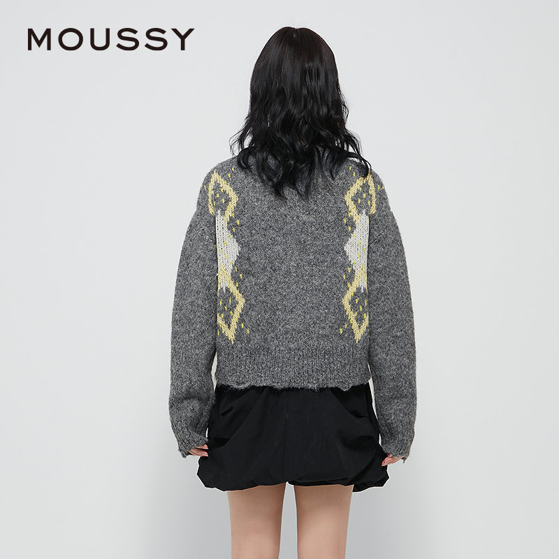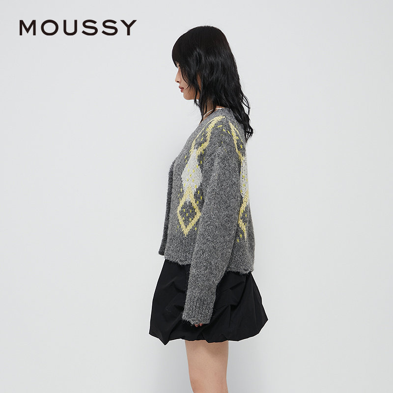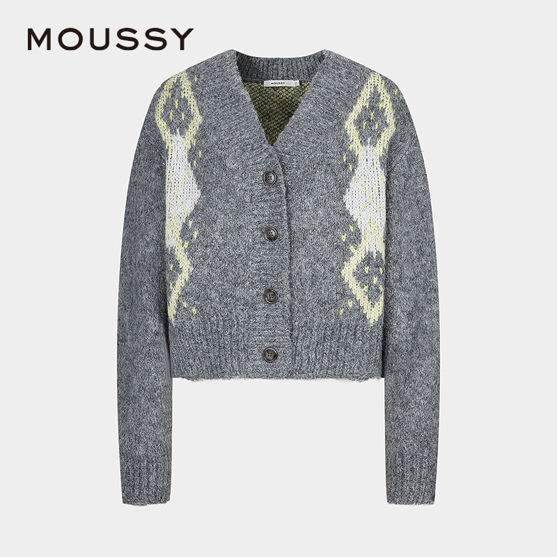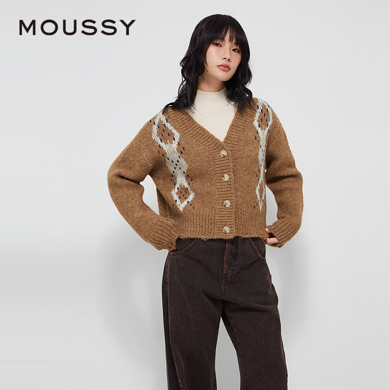 moussy 春季复古撞色菱格毛衣V领针织开衫028HAZ70-1461