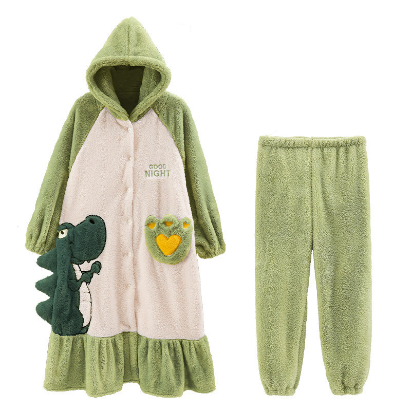 浪莎珊瑚绒情侣睡衣女秋冬季睡袍男士加绒加厚浴袍卡通恐龙套装