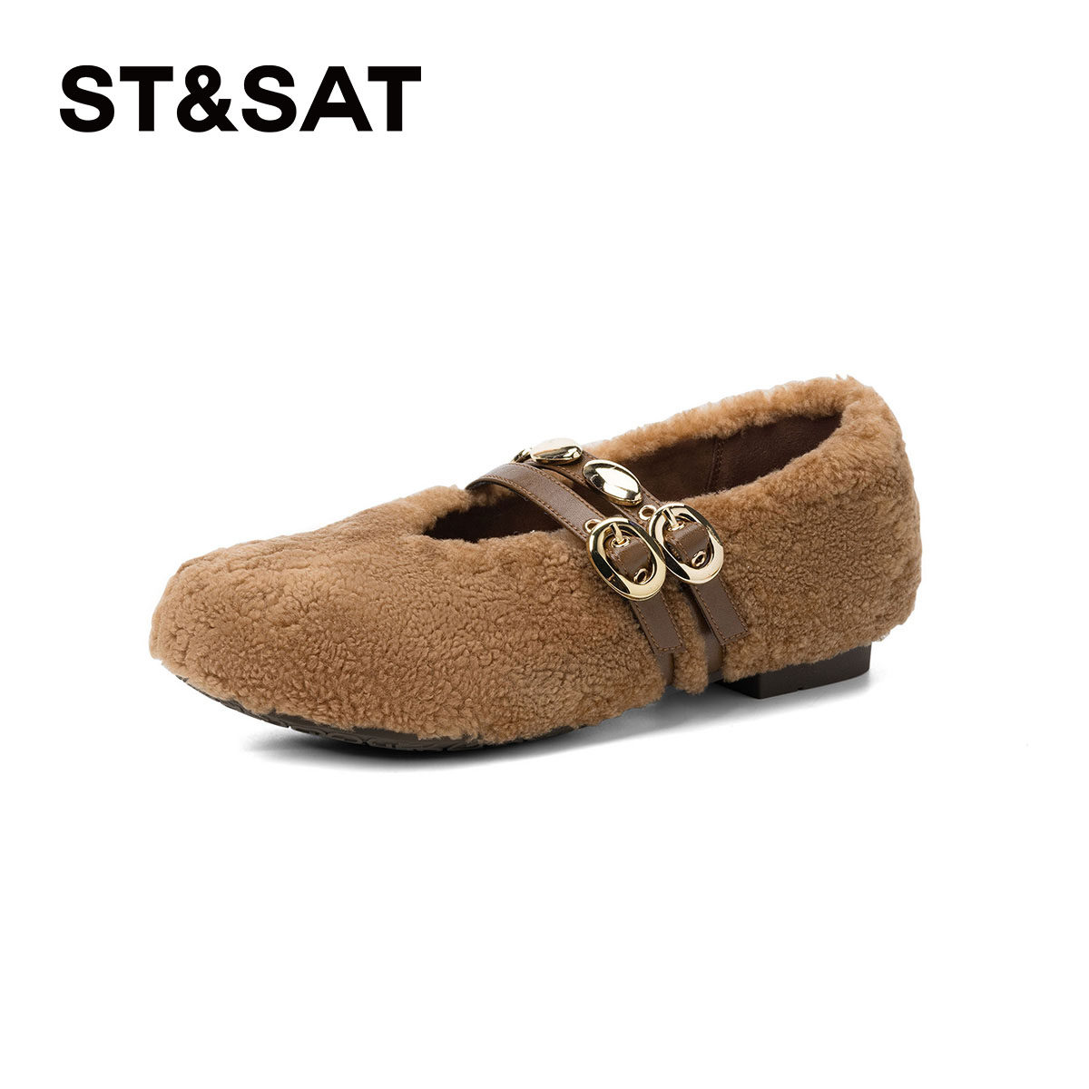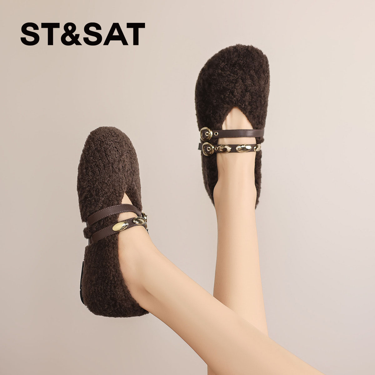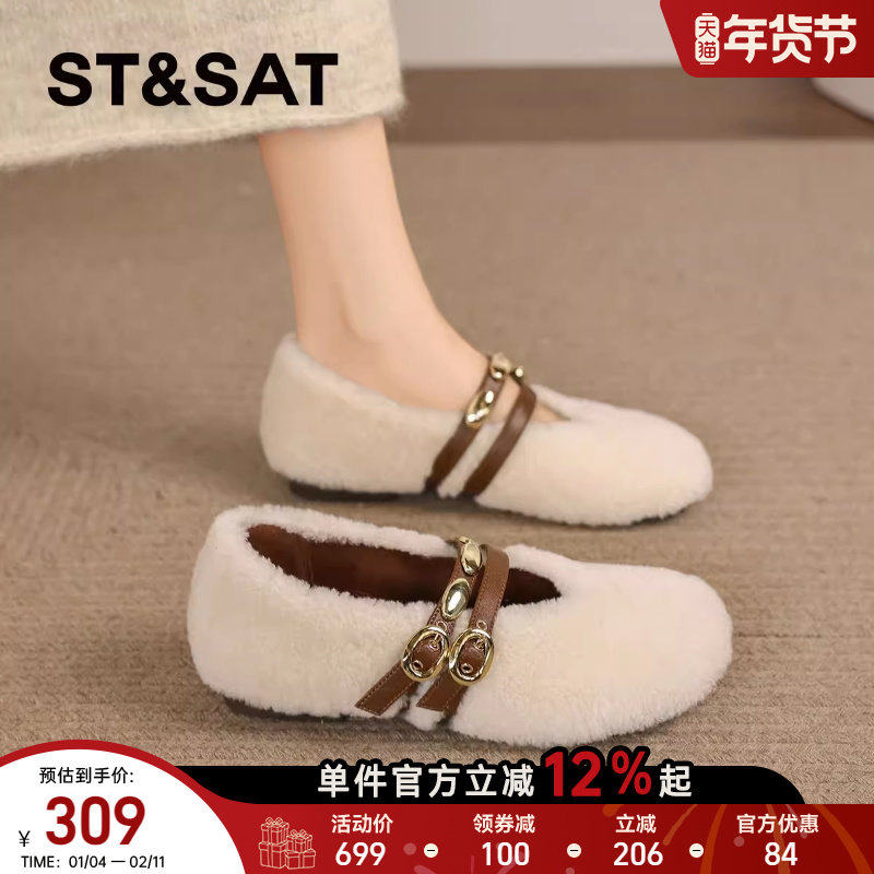 星期六羊毛加绒毛毛鞋玛丽珍鞋女2025秋冬新款百搭平底一字扣单鞋