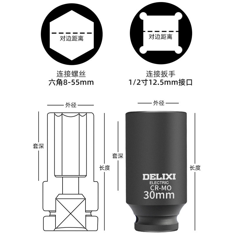德力西1/2寸大飞小重型风炮气动套筒加长厚电动扳手17 21mm套工具