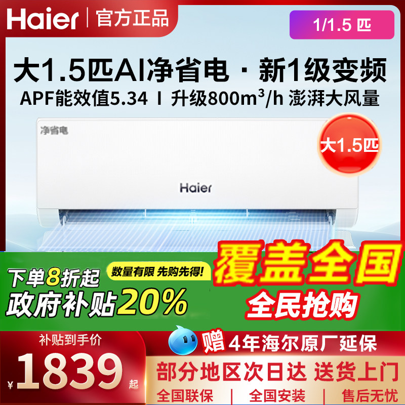 海尔空调1.5匹一级能效家用挂机1匹壁挂式变频卧室冷暖机政府补贴