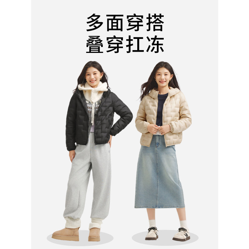拉夏贝尔2025轻薄羽绒服女短款冬季韩版修身圆领无领内胆保暖外套