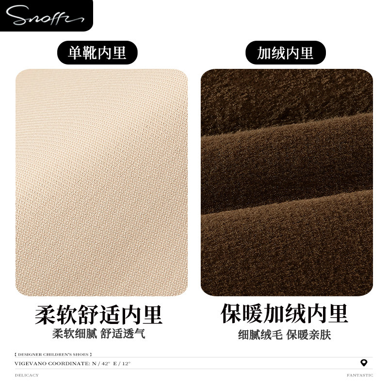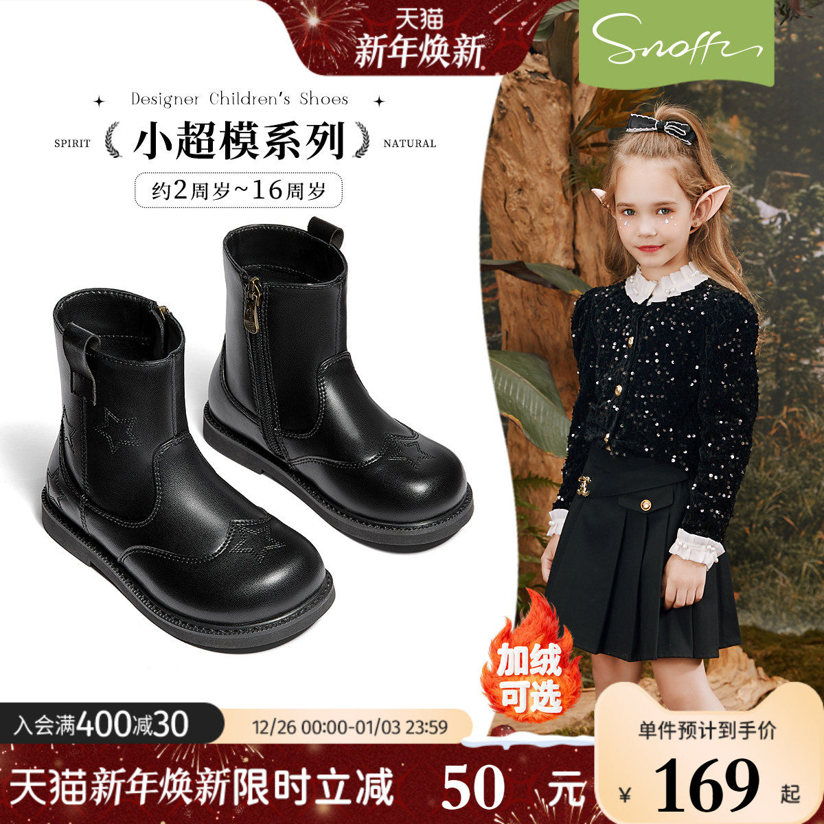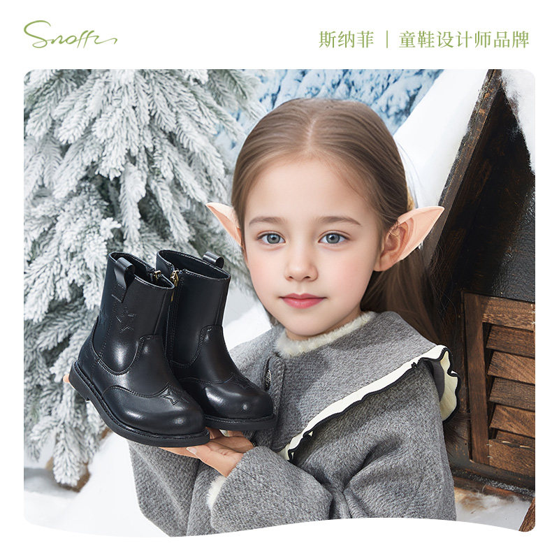 斯纳菲儿童皮靴女童靴子2025秋冬新款小女孩棉靴保暖短靴黑色加绒