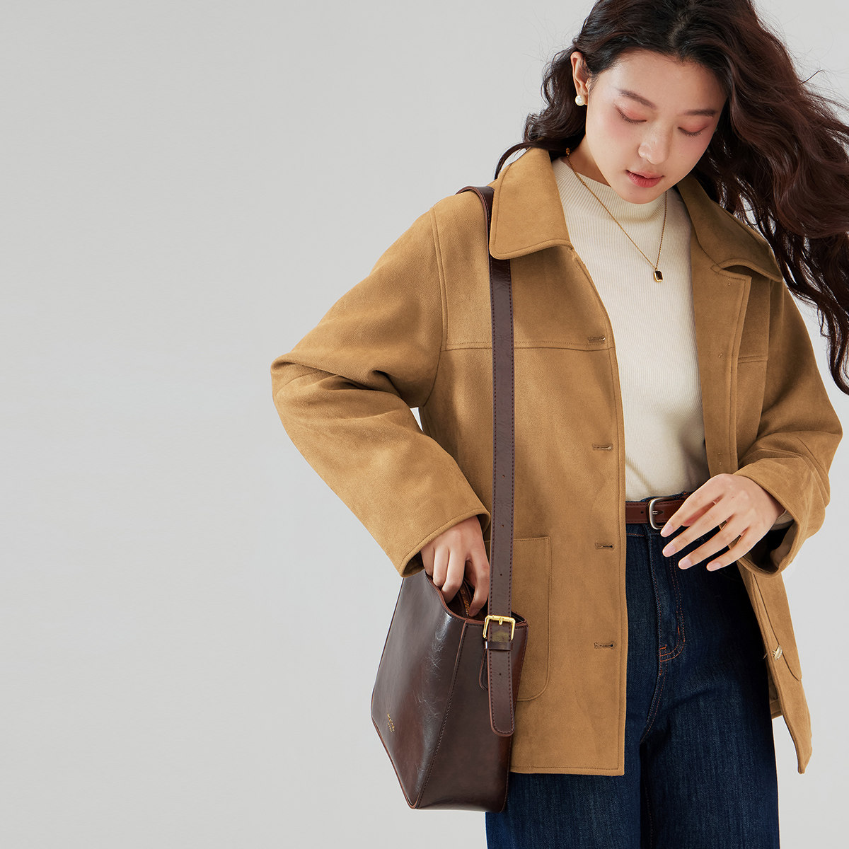 RUISHI芮时重磅驼绒桑蚕丝羊毛慵懒两穿领灰色毛呢大衣秋冬外套女