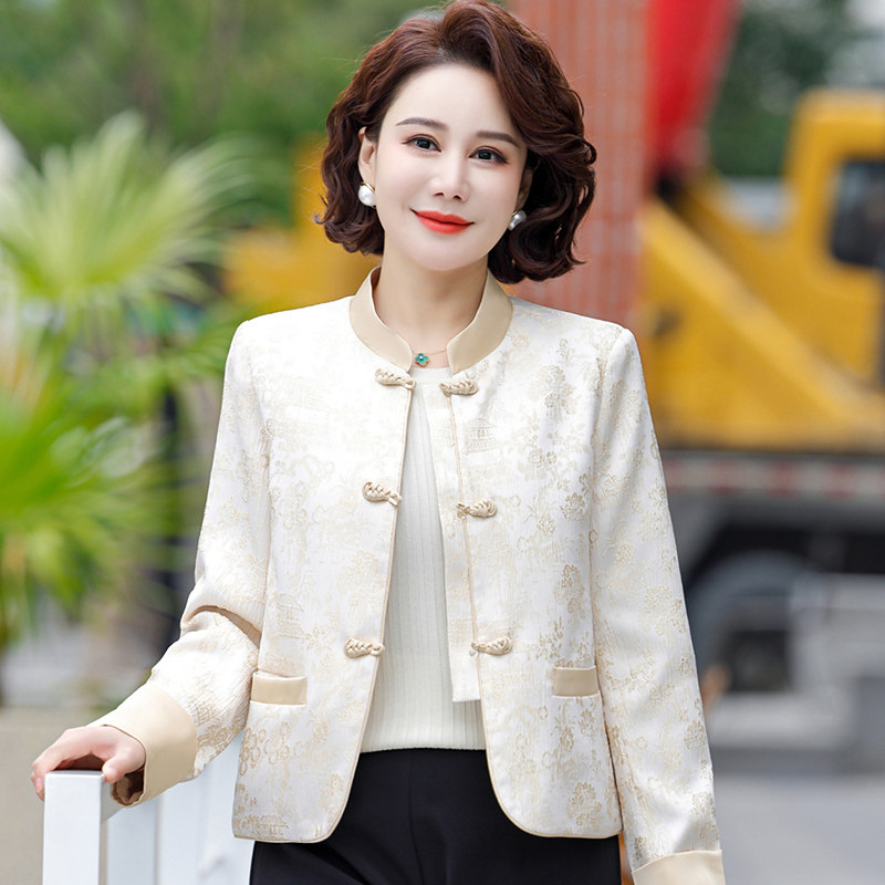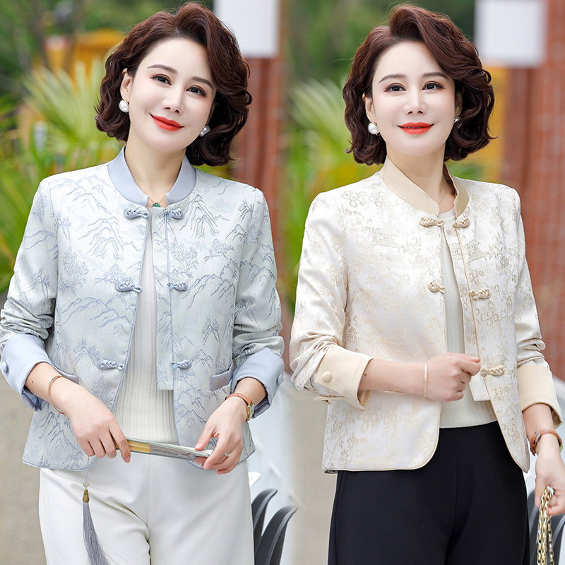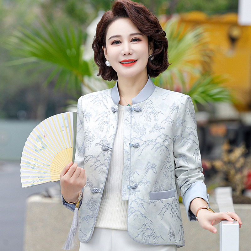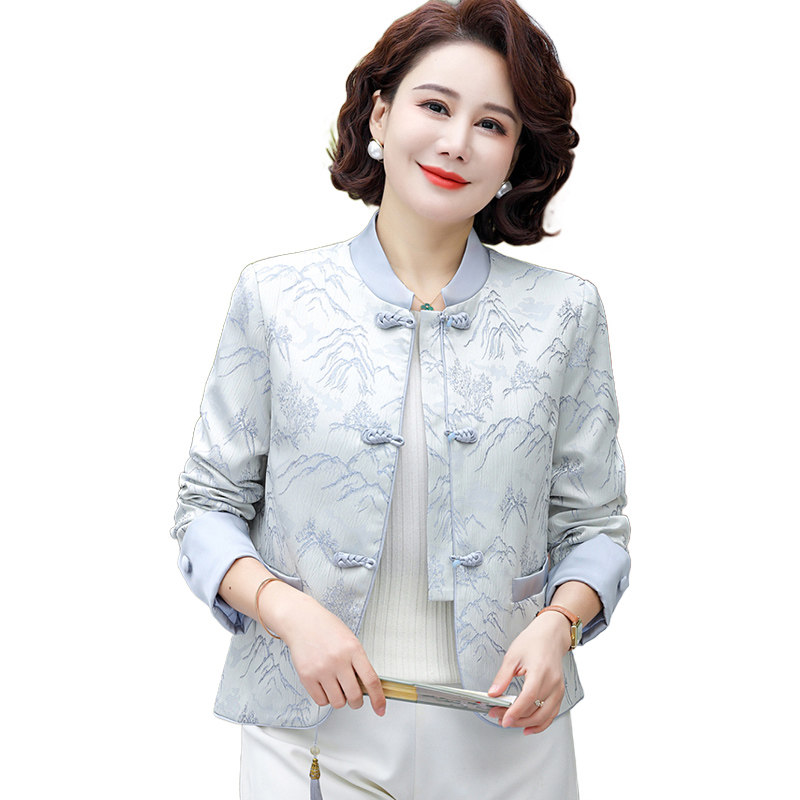 中年妈妈秋装新中式国风外套春秋洋气上衣唐装中老年女装气质蓝色