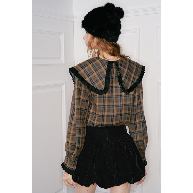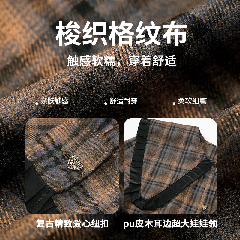 妖精的口袋PU皮拼接娃娃领衬衫女2026年早春新款甜美格纹内搭衬衣