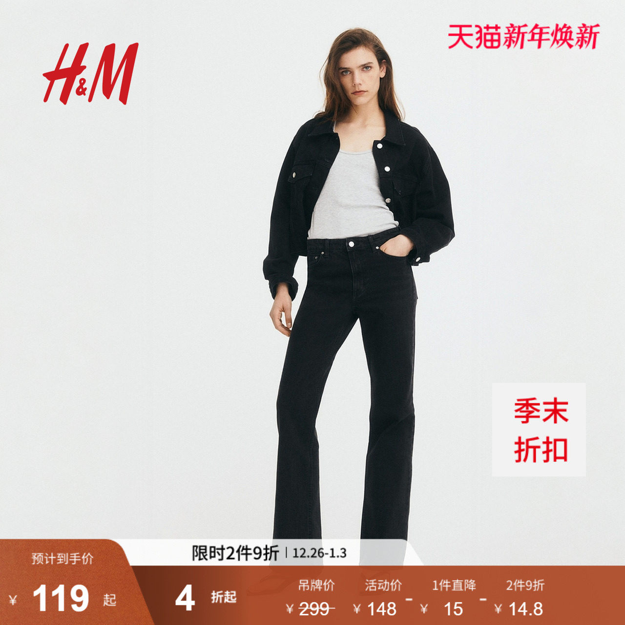 HM女装牛仔裤微紧身牛仔裤复古修身高腰微喇潮流简约长裤1198343