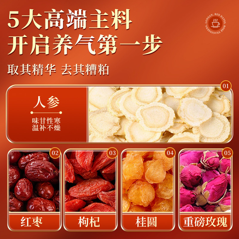 同仁堂人参红枣桂圆枸杞玫瑰花茶女生补气养血调理女人养生茶包