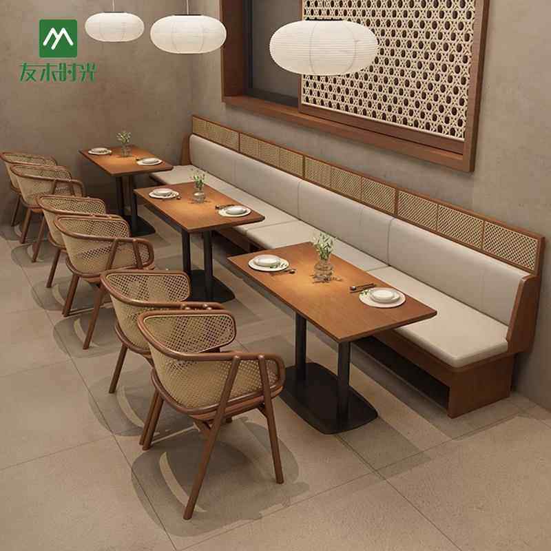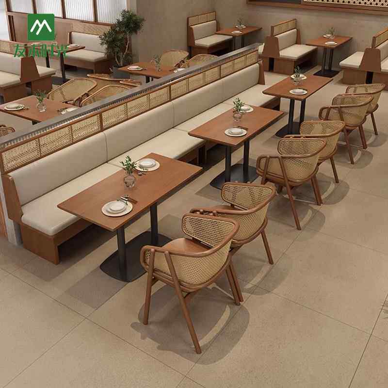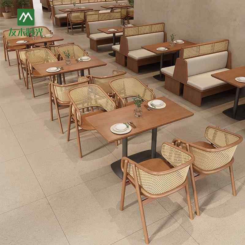 烘焙店餐饮店咖啡厅桌椅组合连锁主题餐厅西餐厅实木编藤卡座沙发