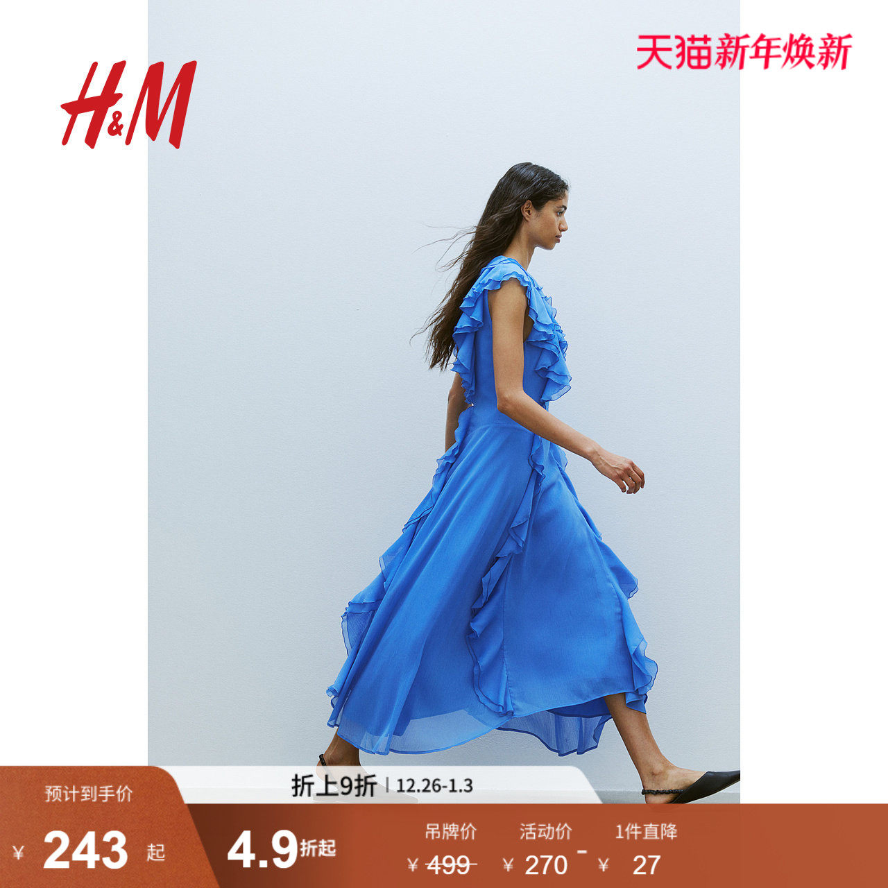HM女装连衣裙冬季女士潮流时尚荷叶边雪纺连衣裙1236797