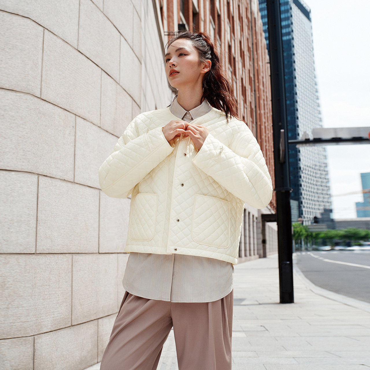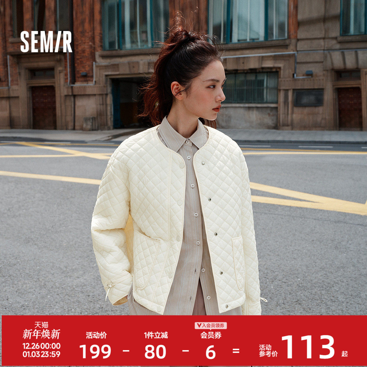 森马棉服女肌理菱格内搭宽松慵懒风2025冬季新款抽绳轻薄棉衣百搭