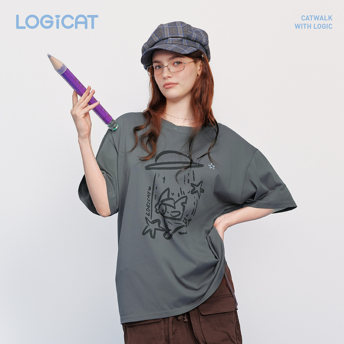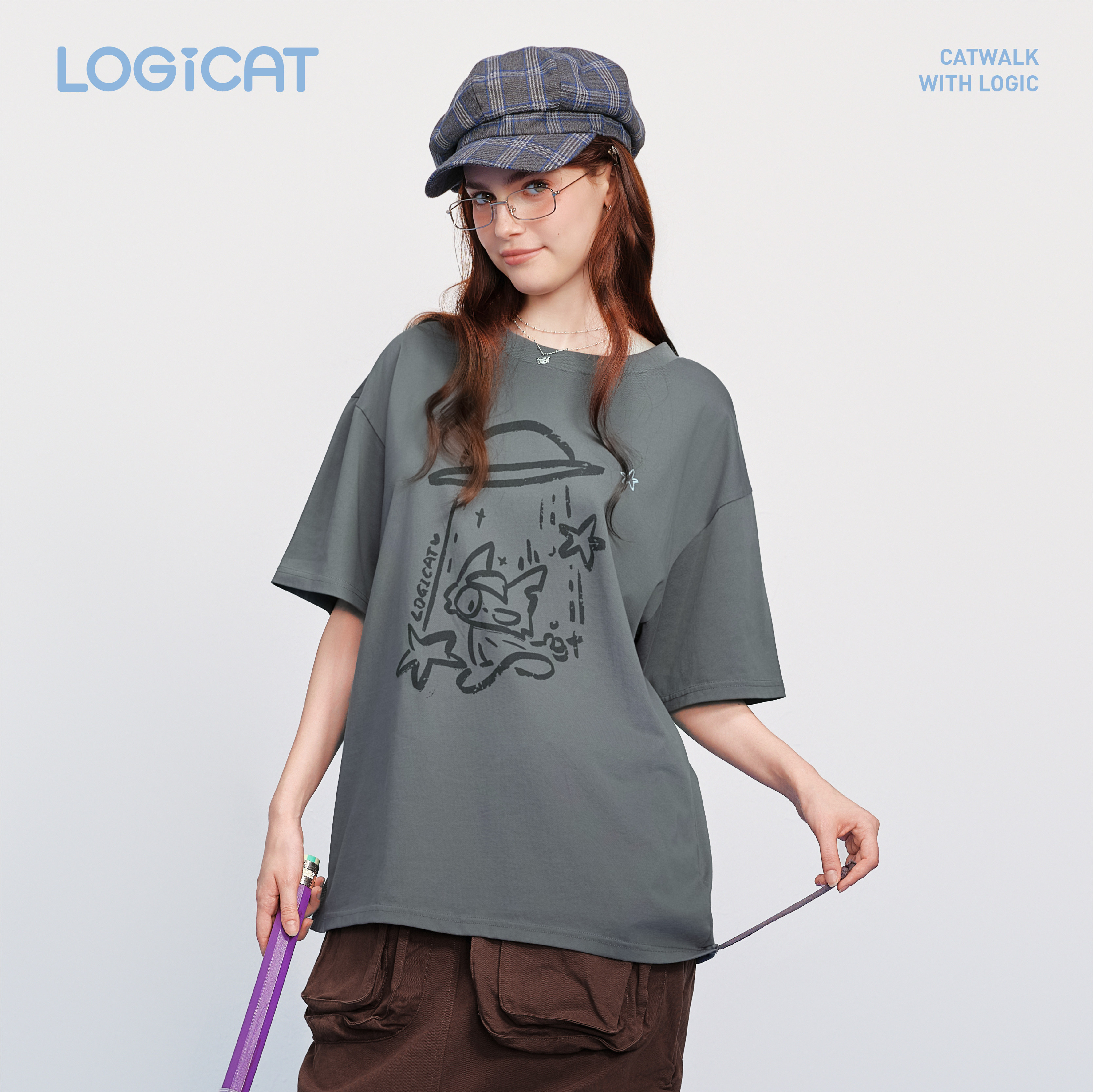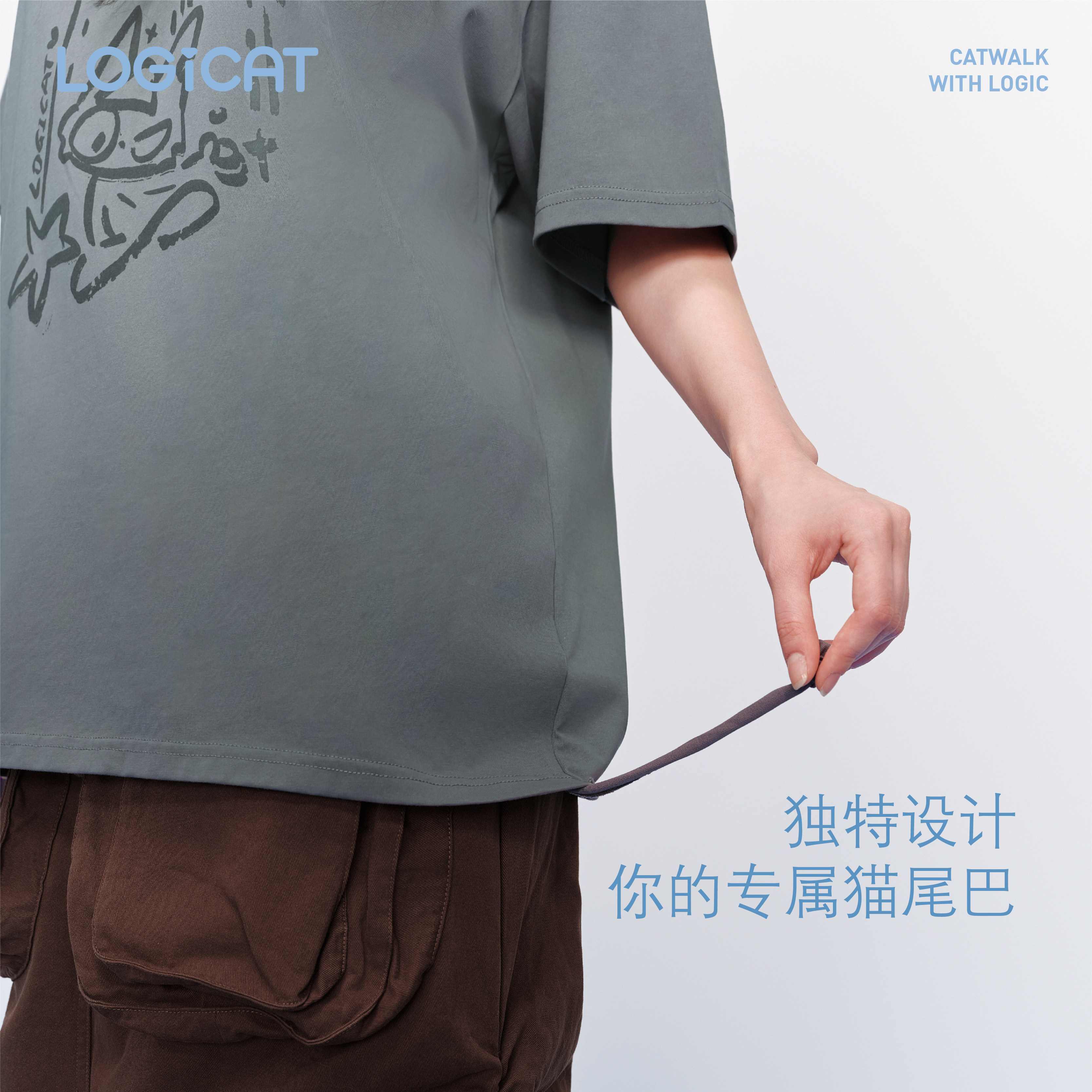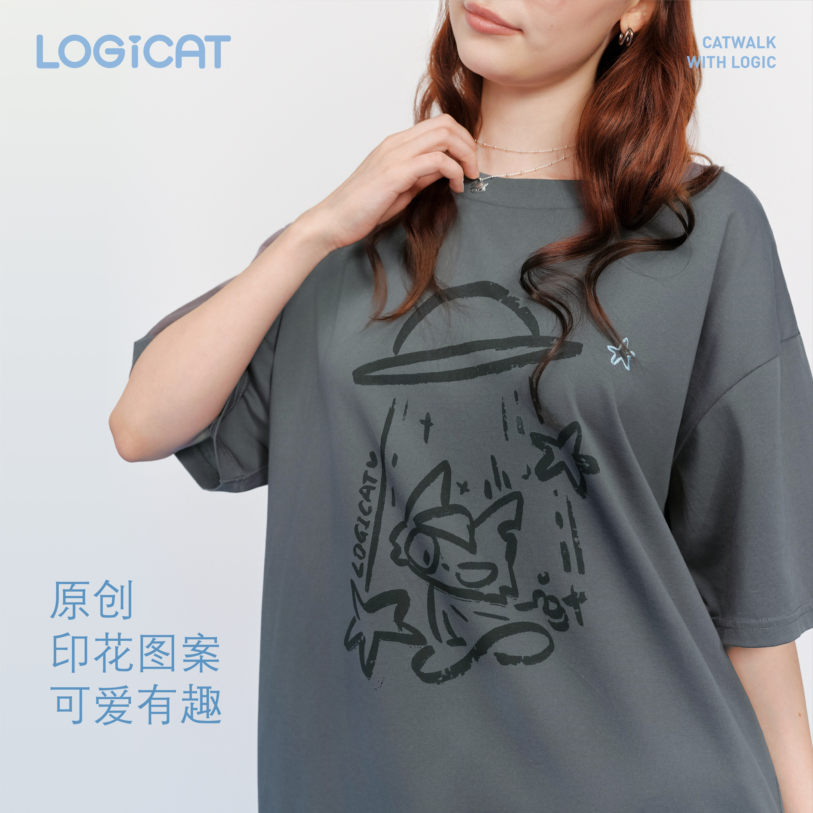 蒲熠星同款LOGICAT灰色猫咪印花T恤舒适百搭通勤宽松男女情侣短袖