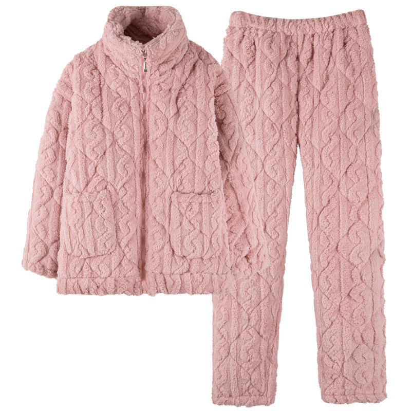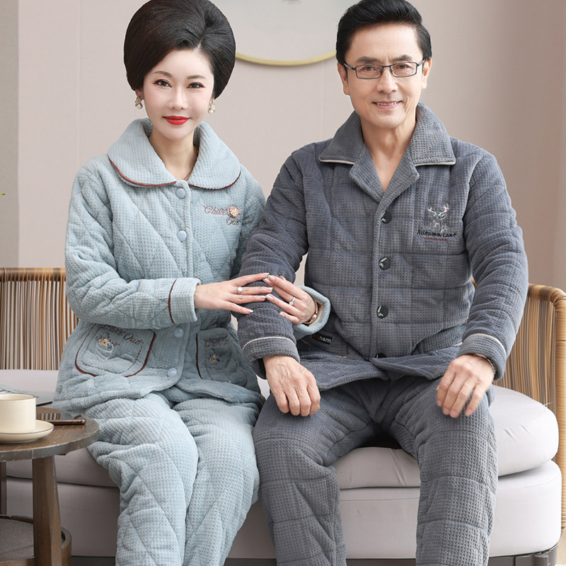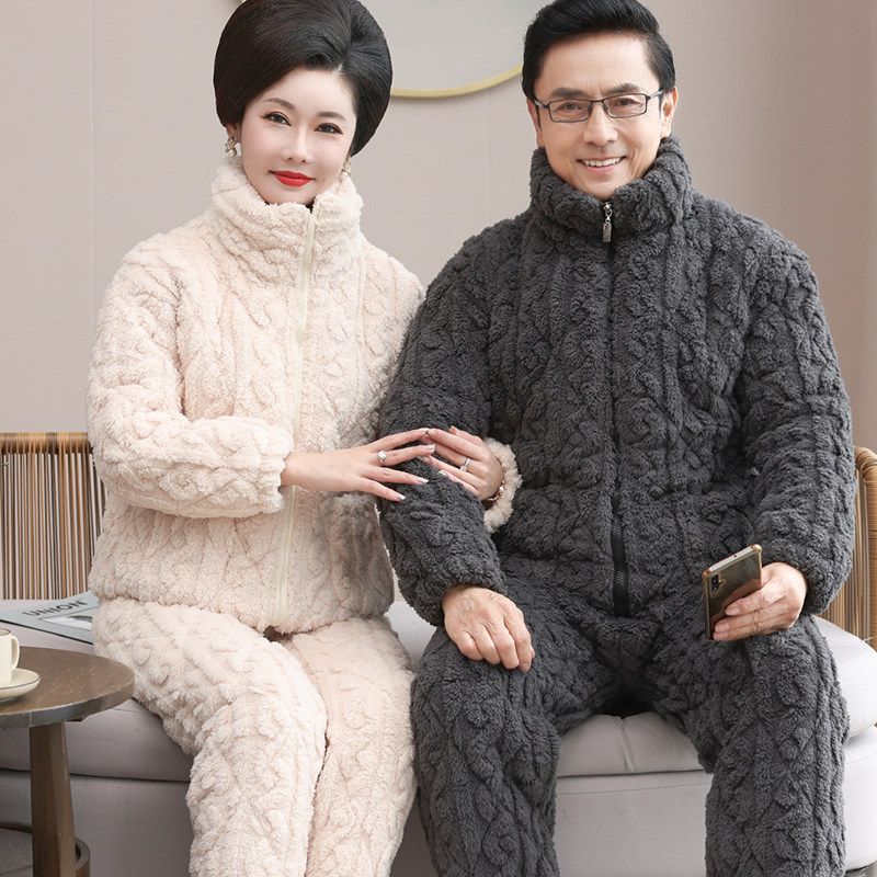 中老年中年爸爸妈妈男士睡衣女冬季珊瑚绒夹棉三层加厚保暖家居服