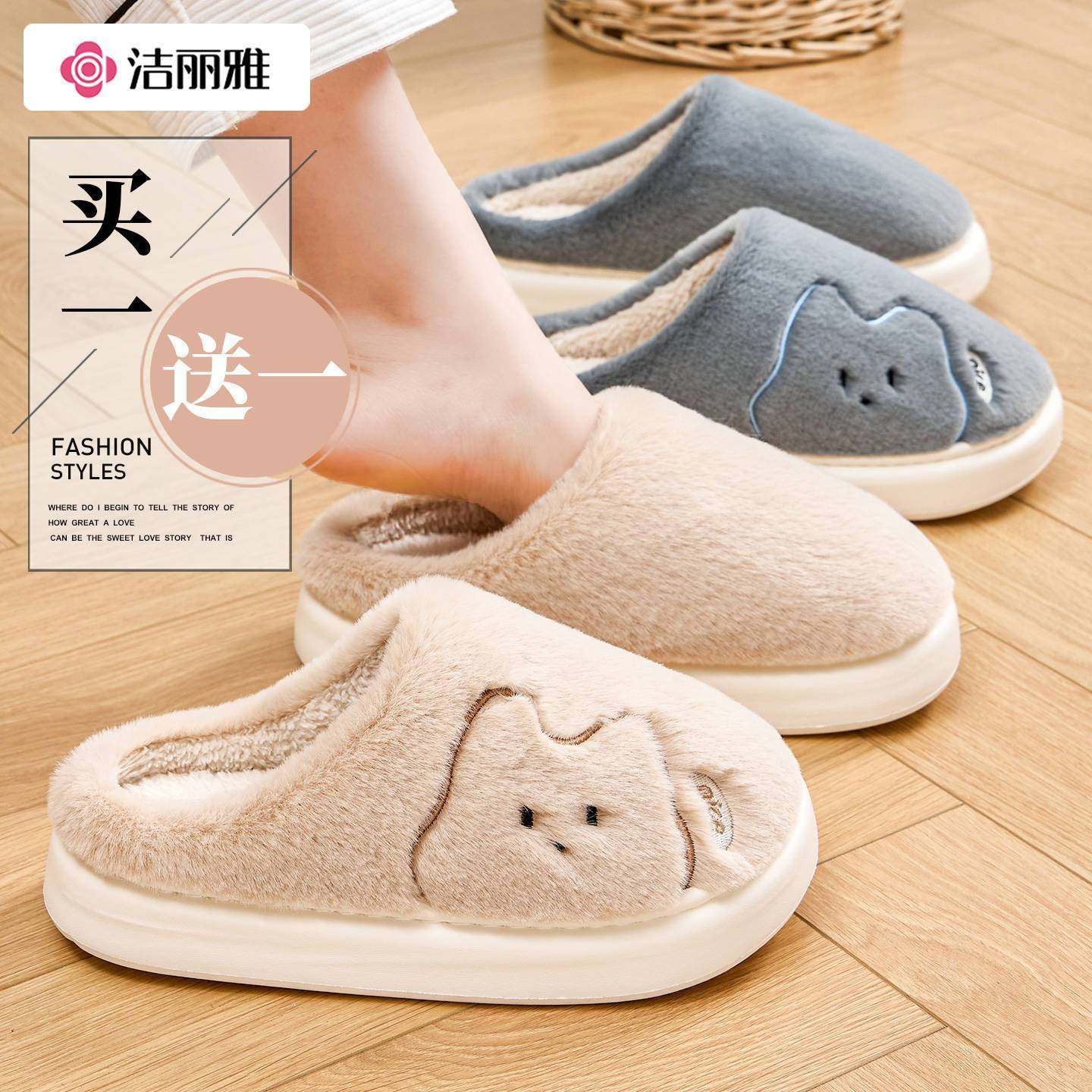 洁丽雅买一送一棉拖鞋女士冬季居家情侣一对保暖毛拖鞋男款冬厚底