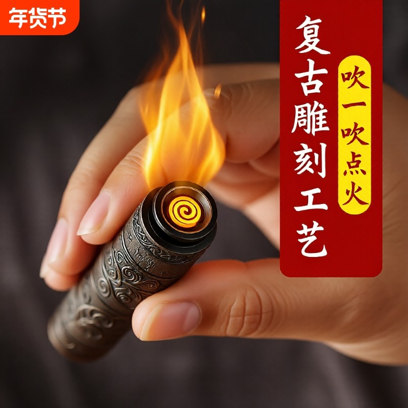 火折子吹一吹打火机静音古代黑檀木雕刻防风充电吹气点烟器送男友