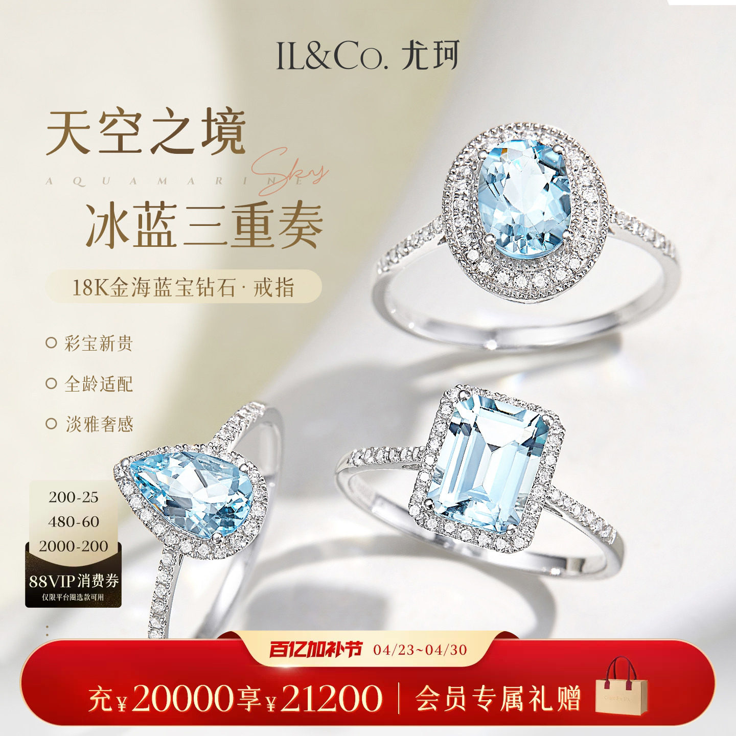 ILCO尤珂「冰蓝鸽子蛋」18K金海蓝宝戒指天然彩宝钻石克拉椭圆戒