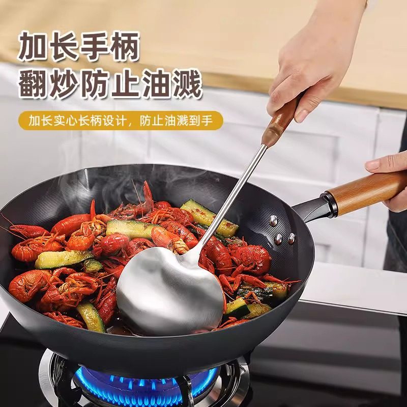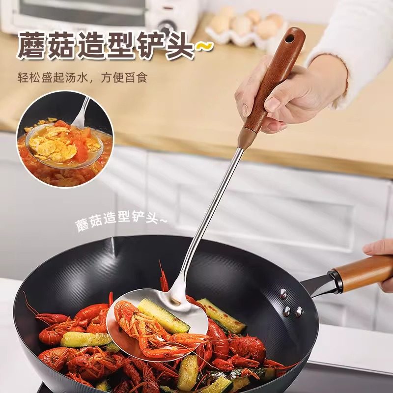 胡桃木蘑菇铲子防烫木柄炒勺不锈钢家用铁铲炒菜勺汤勺专用铁锅铲
