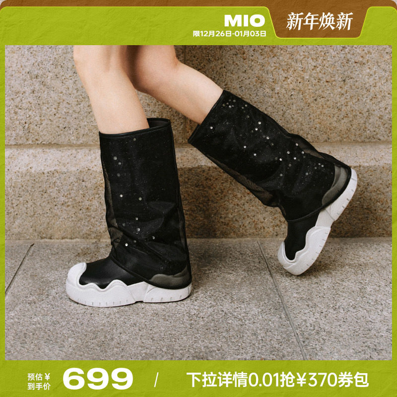 MIO米奥裤管靴冬季机车套筒靴撞色圆头网纱烟筒靴厚底显瘦中筒女