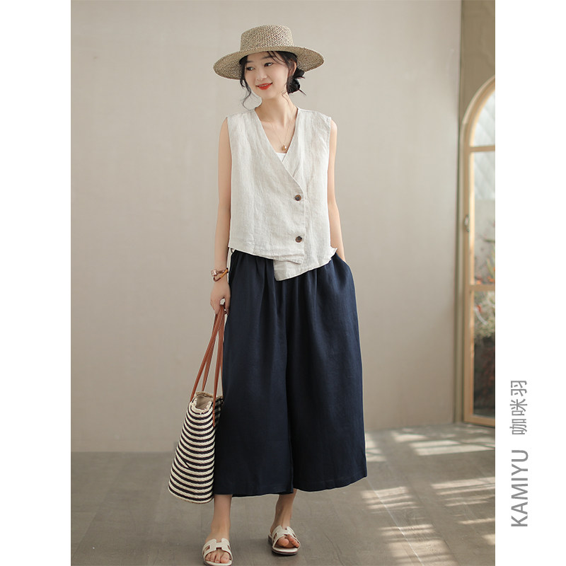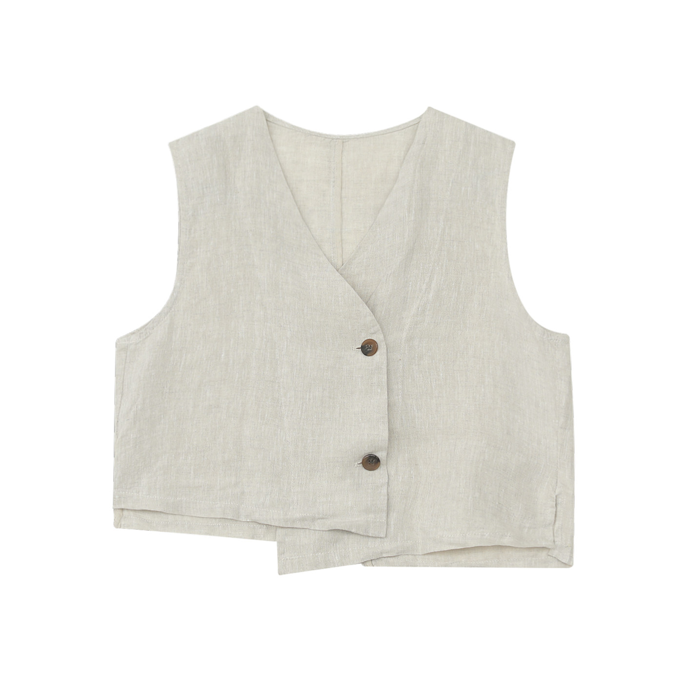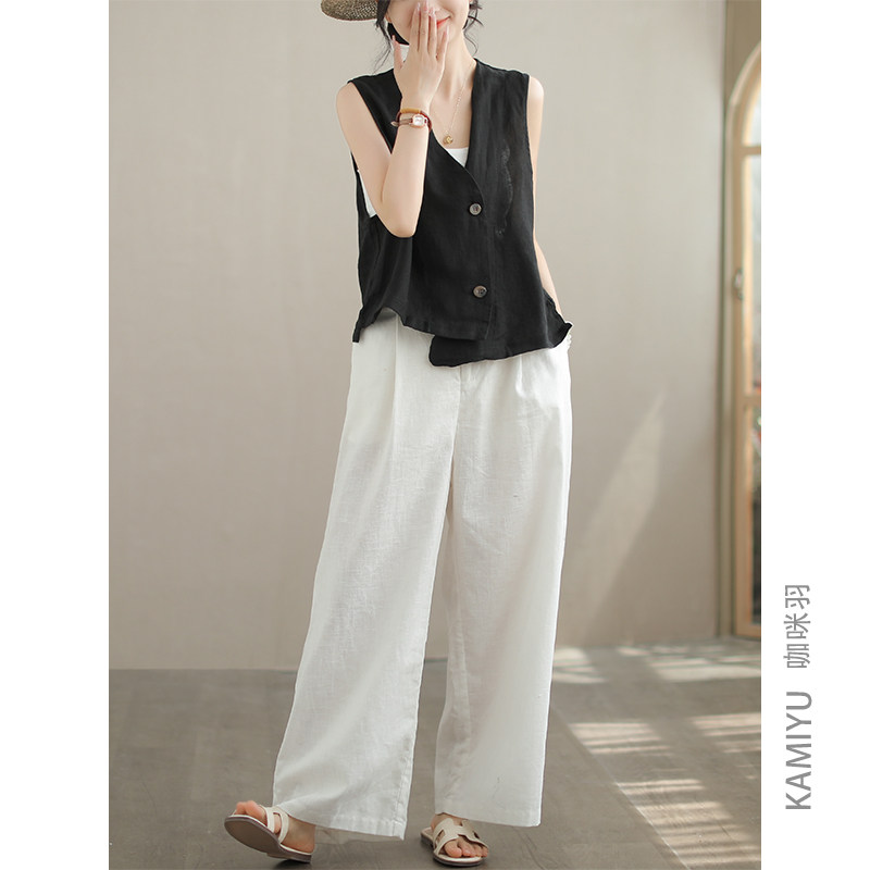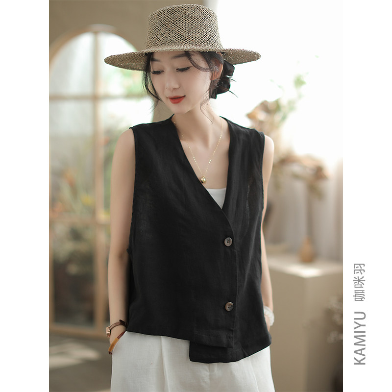 咖咪羽100%亚麻女新款无袖女士宽松拼接个性下摆女装上衣马甲外套