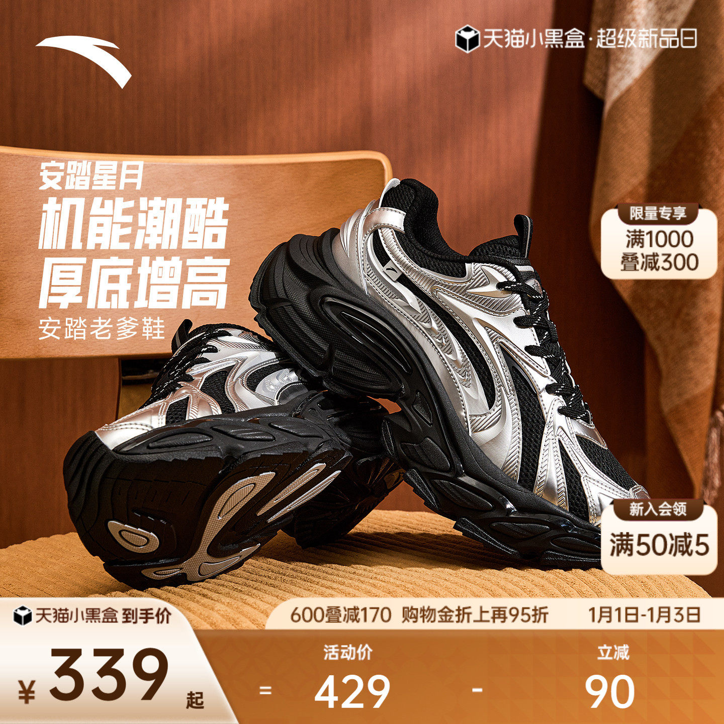 安踏星月丨厚底增高老爹鞋休闲鞋冬季男鞋时尚复古撞色潮流运动鞋